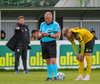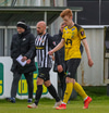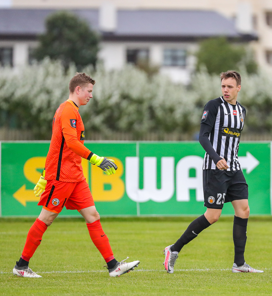 Ísak Snær fer með hendurnar í skallabaráttu við Finn Orra og hittir hann í andlitið sýnist mér, fær gott tiltal frá Ella.
