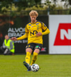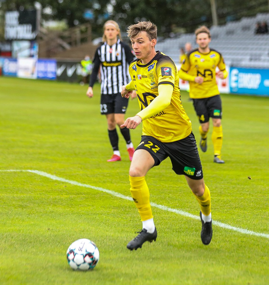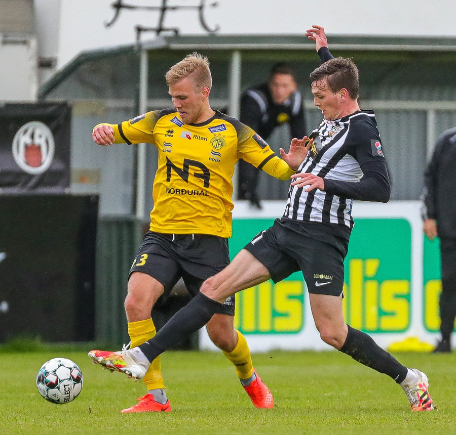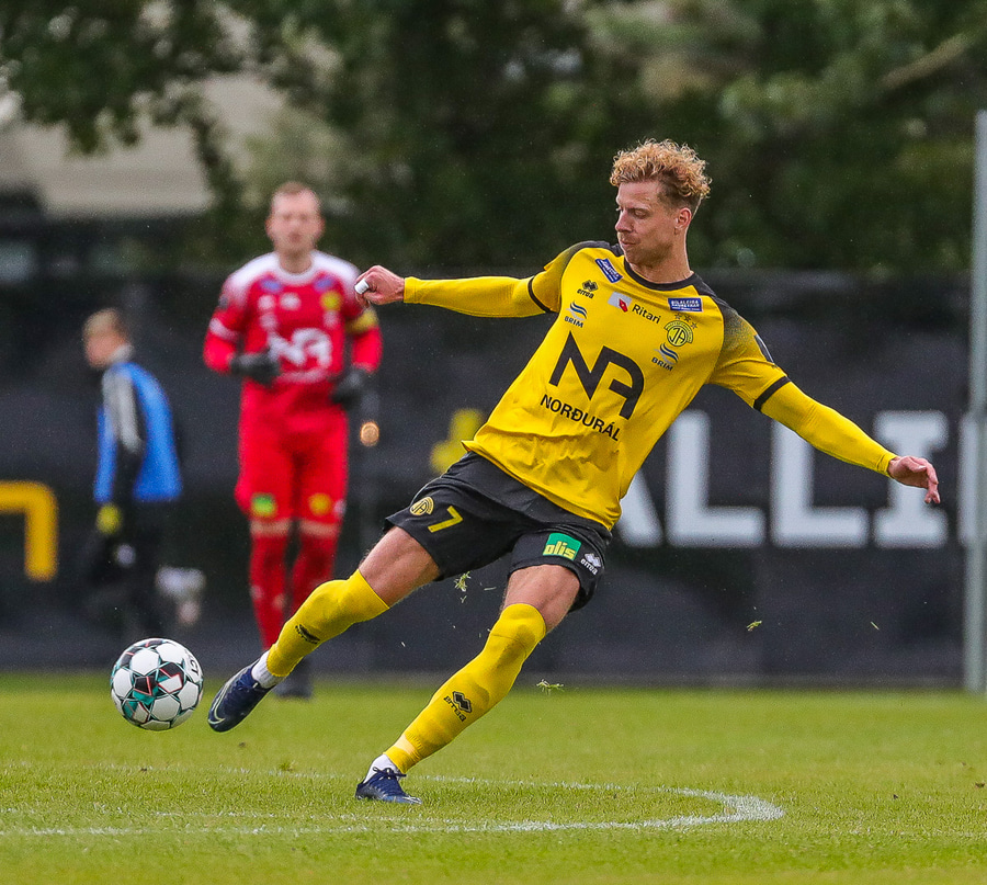 Tekur Ísak Snæ hressilega niður hérna úti á hægri kantinum, hárrétt spjald.