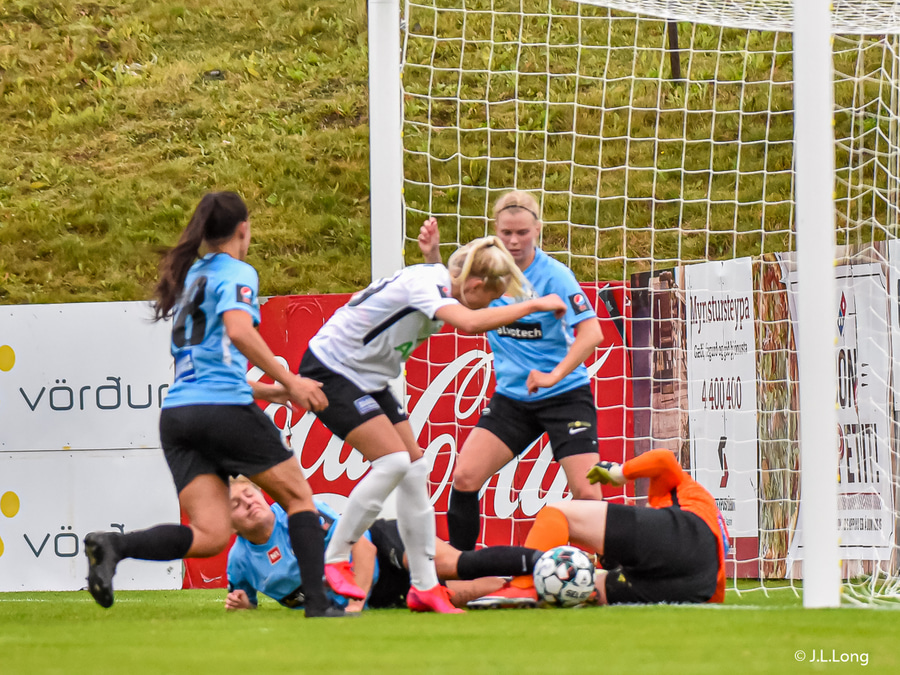 Valgerður með langan bolta inn á Phoenetiu sem klárar laglega í hægra hornið og það lifnar verulega yfir stúkunni