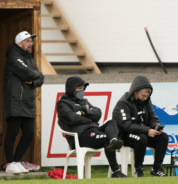 Freyþór skallar spyrnu Lárusar í burtu og Tómas Örn hreinsar svo næstu fyrirgjöf í burtu.