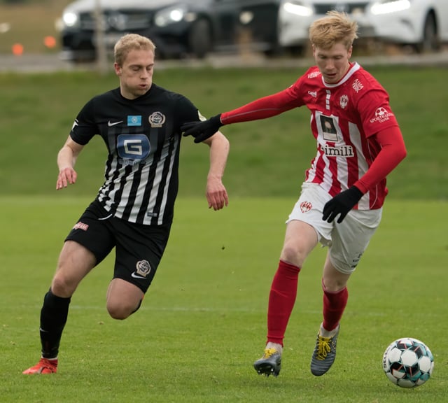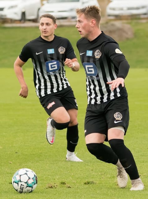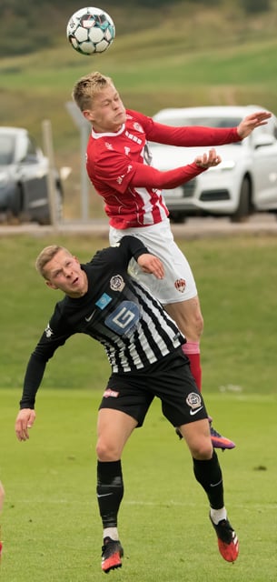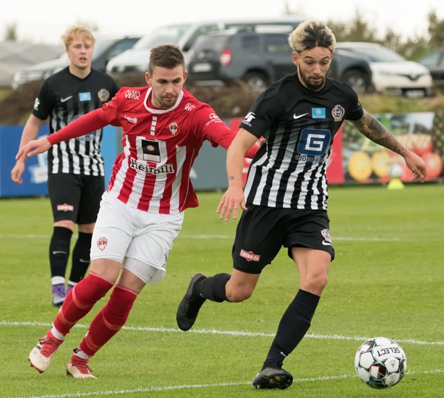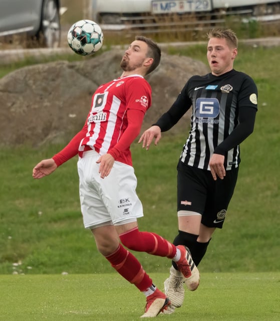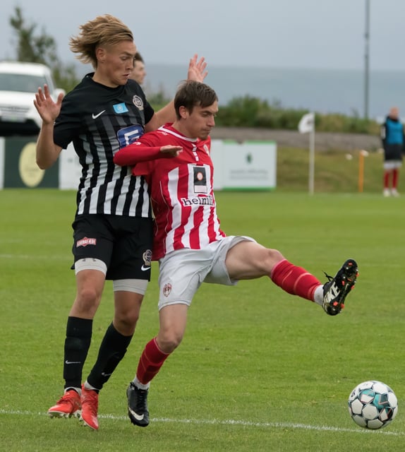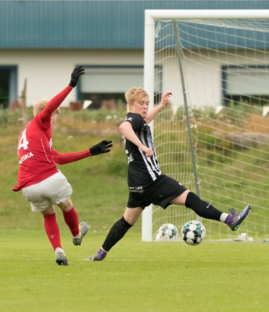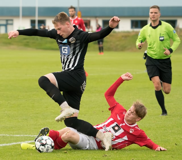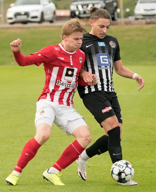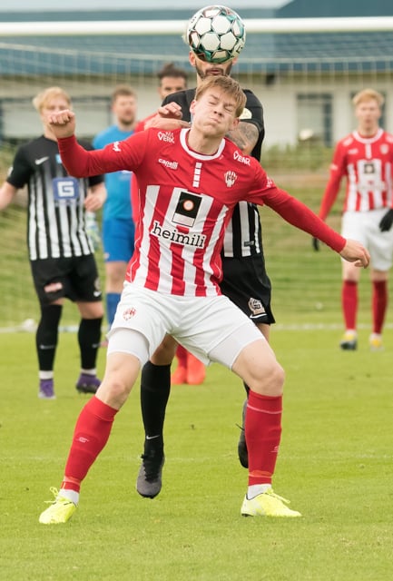 Ágúst labbar framhjá Atla úti vinstra megin en Atli gerir mjög vel og vinnur boltann með tæklingu.