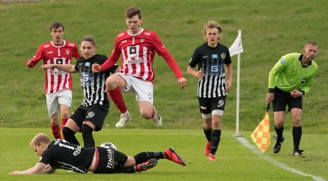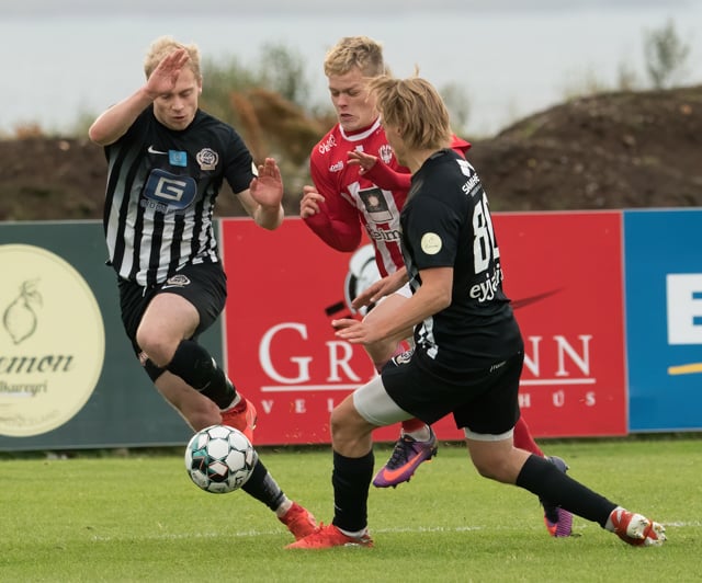 Lárus með skot sem Tómas Örn kemst fyrir og Steinþór eltir þennan lausa bolta uppi inn á teignum.