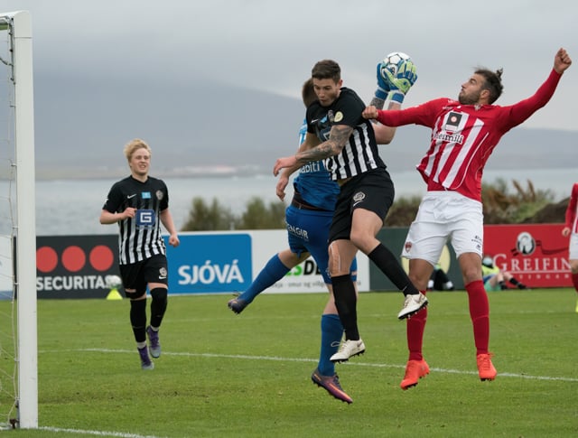 Rúnar skallar boltann til hliðar og Birkir á svo fyrirgjöf inn á teiginn sem Steinþór grípur.