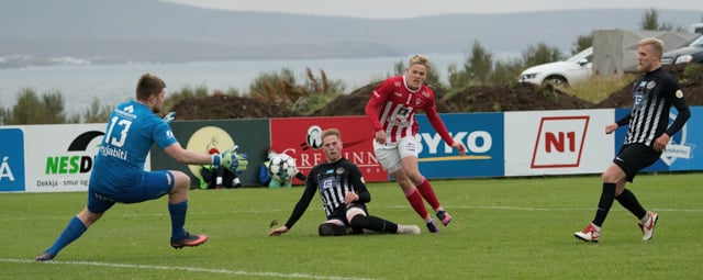 Sýndist það vera Franko Lalic bara sem þrumaði boltanum út á hægri vænginn, Oliver skeiðaði framhjá Gústa og skildi hann eftir. Kláraði með föstu skoti í fjærhornið framhjá Steinþóri. 0-1 fyrir gestina!