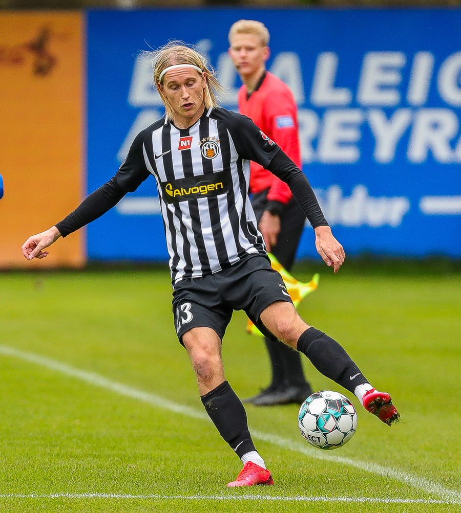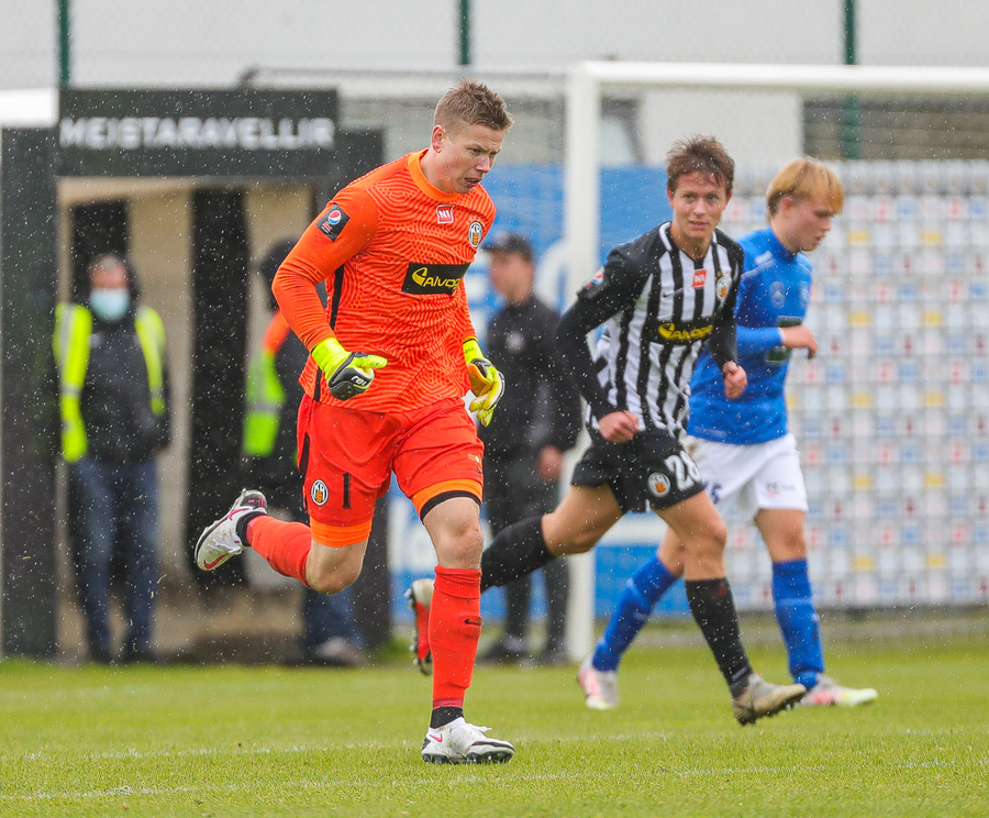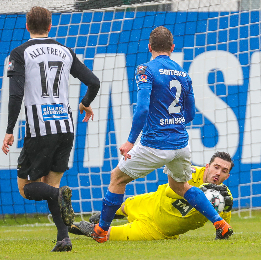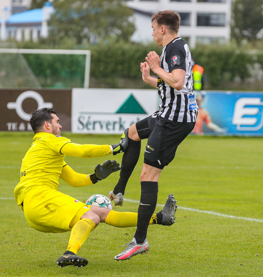 Stefán Árni fer hér skemmtilega með boltann í vítateignum og á skot en það er beint á Halla í markinu.