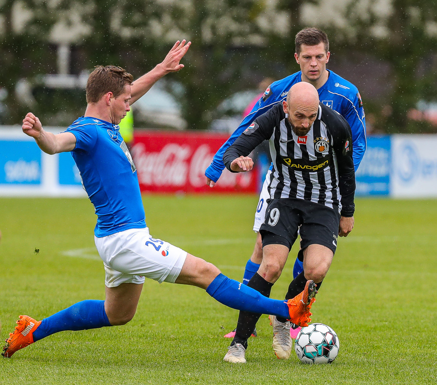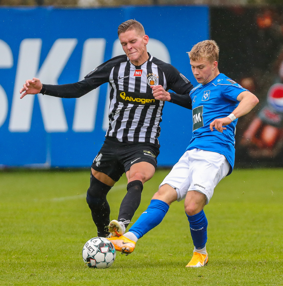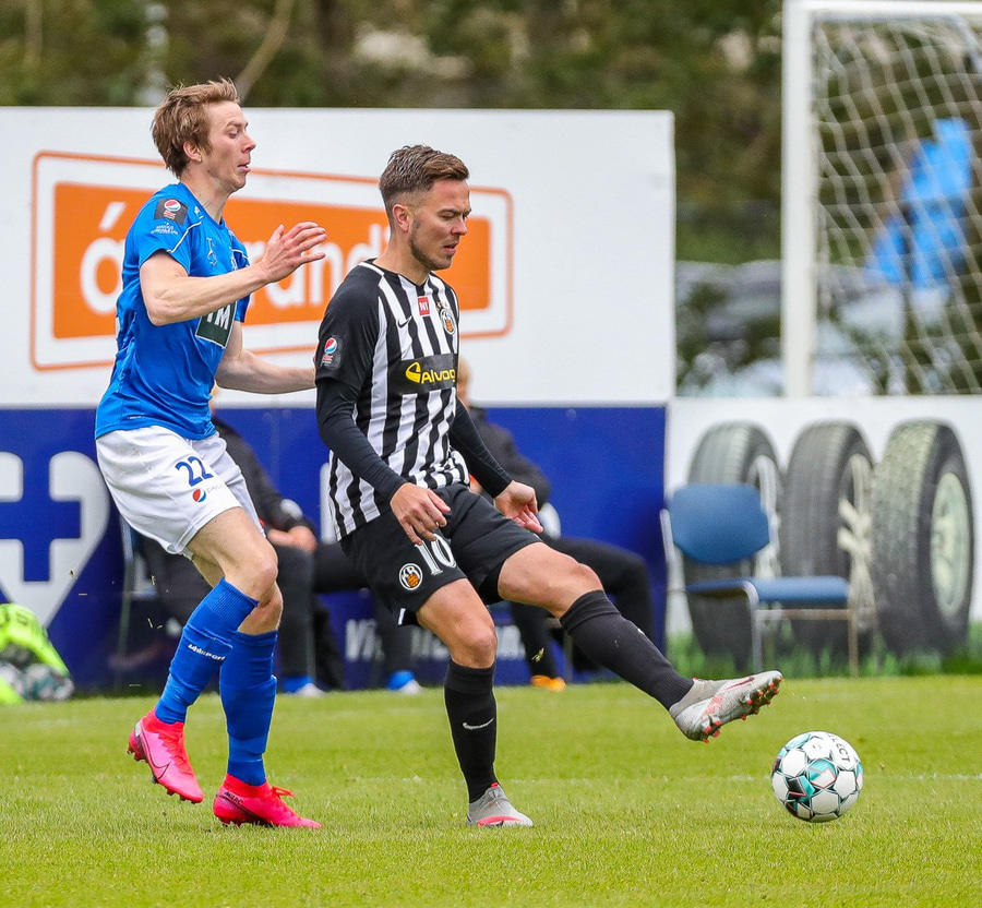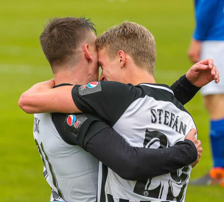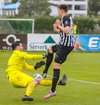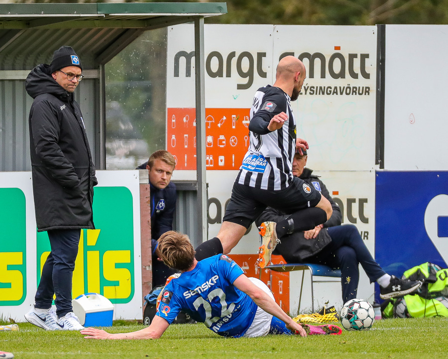 Stefán Árni fer hér skemmtilega með boltann í vítateignum og á skot en það er beint á Halla í markinu.