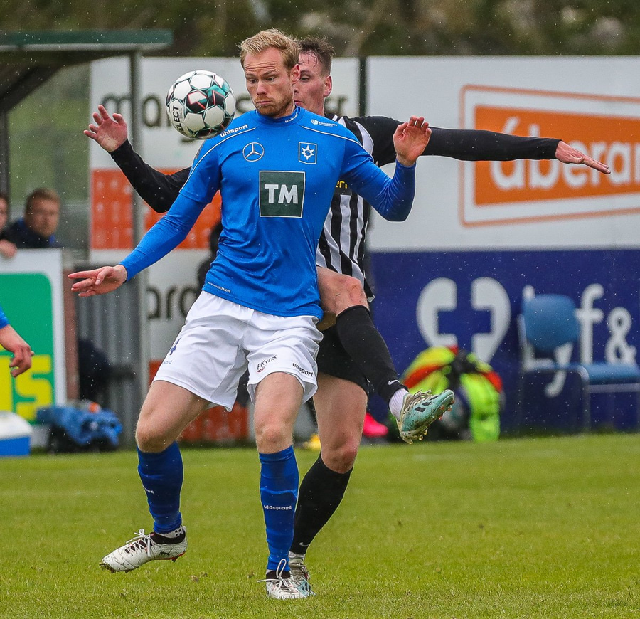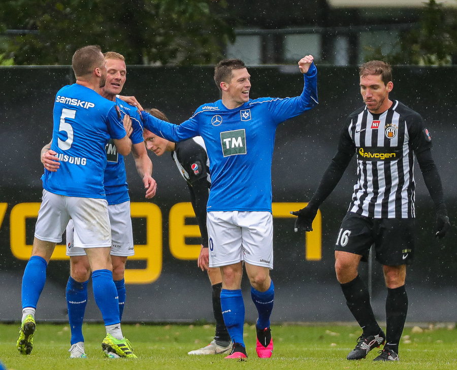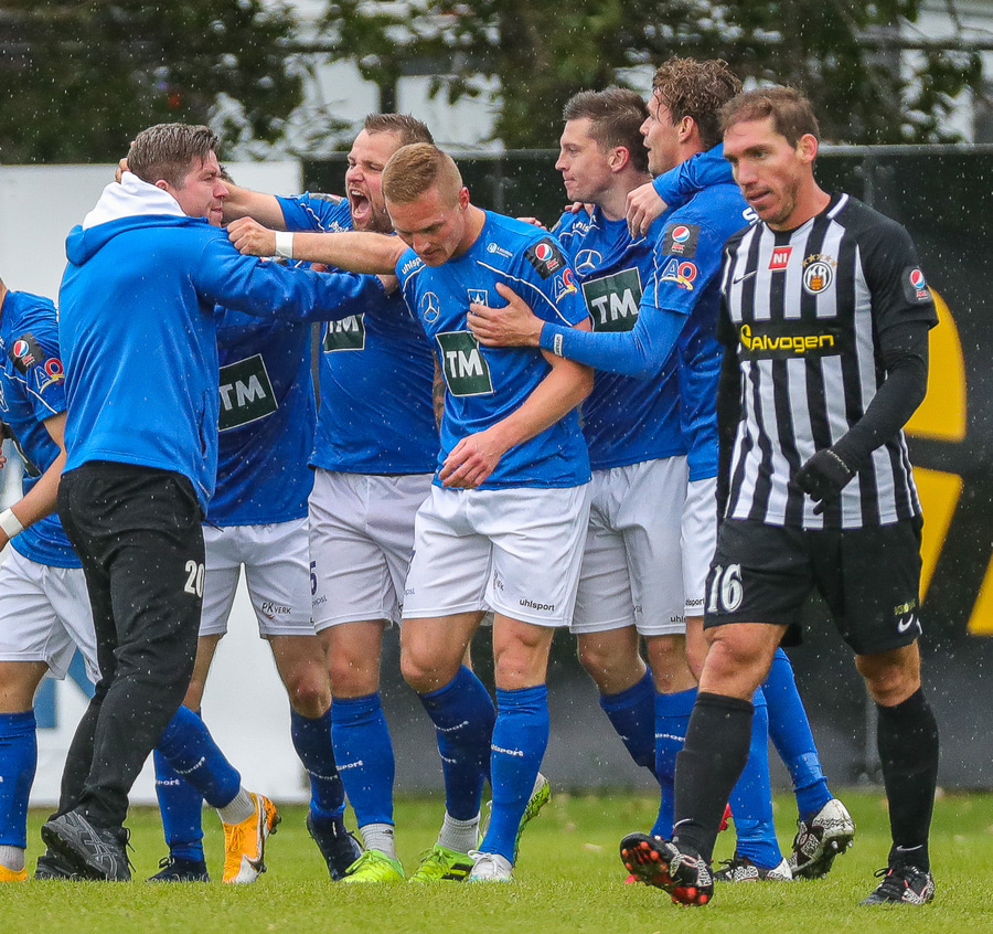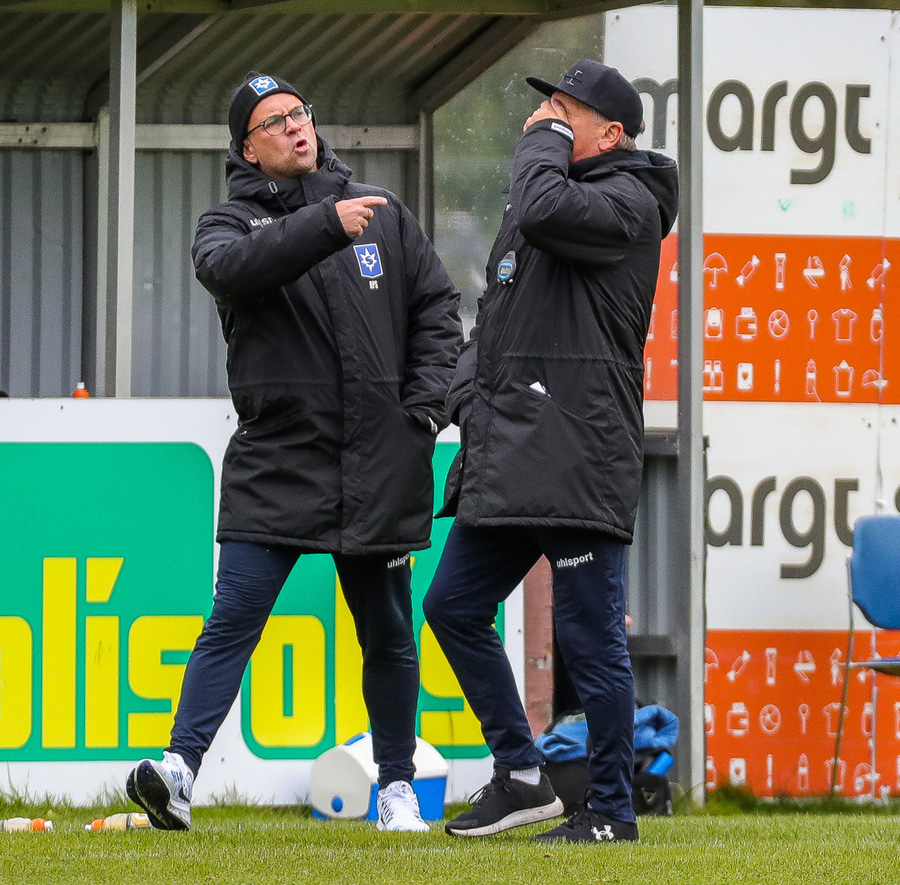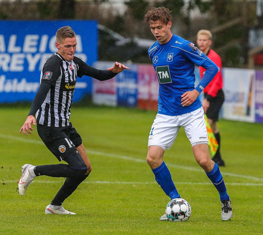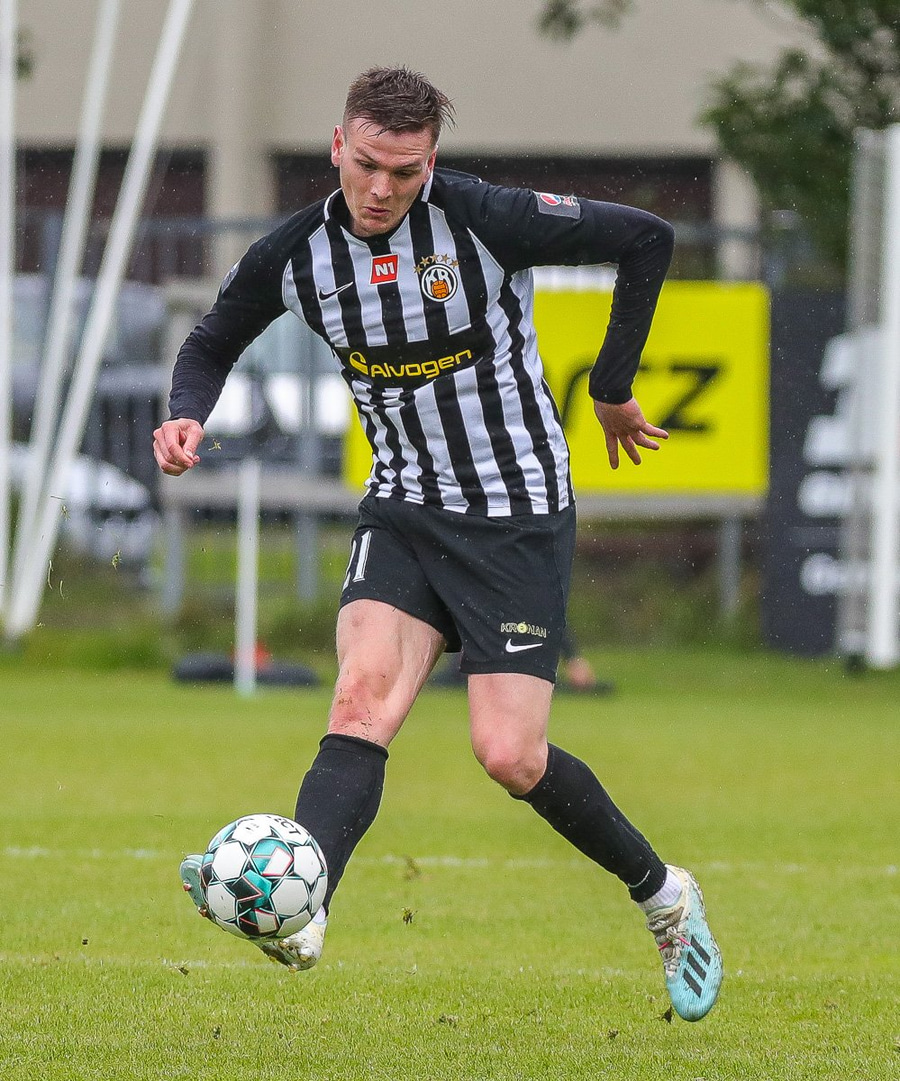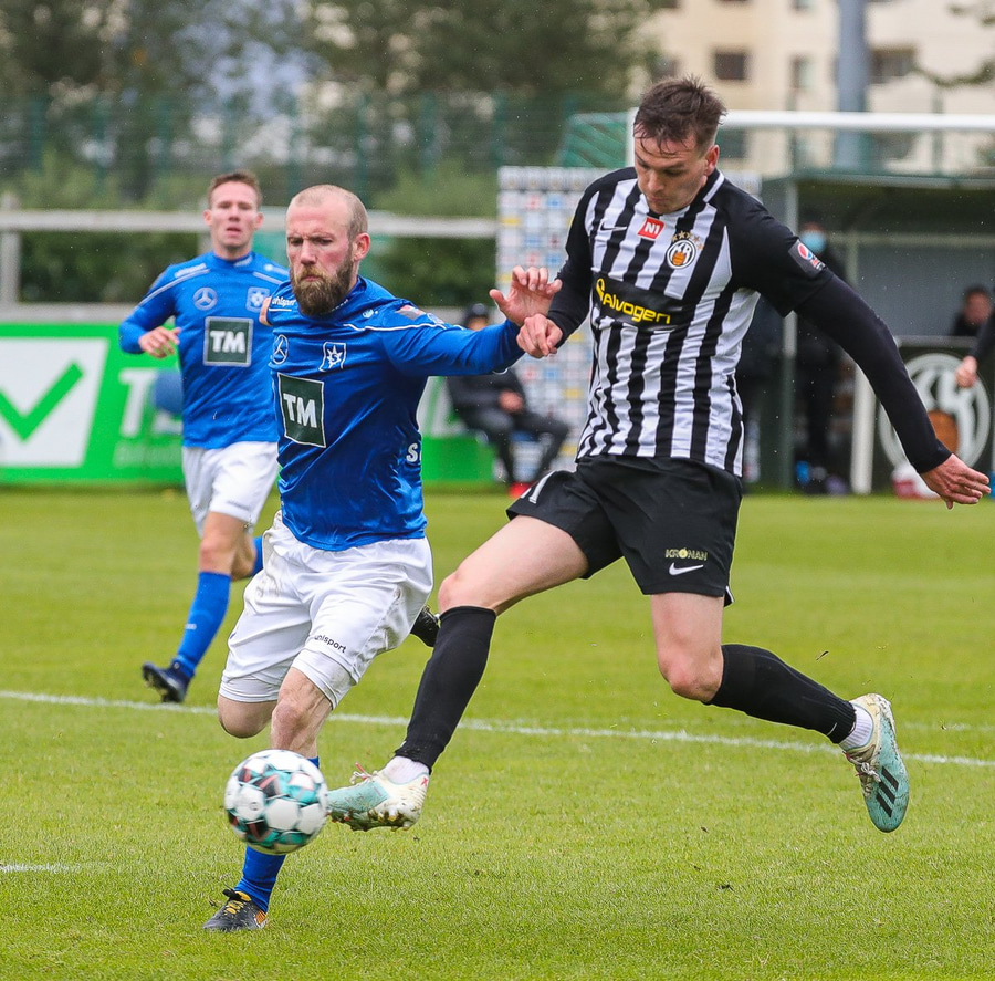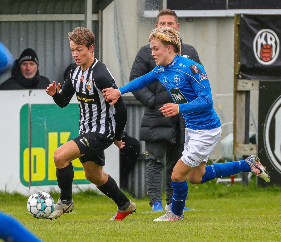 Finnur Tómas missir hann klaufalega við eigin vítateig til Þorsteins Más sem að rennir honum á Hilmar Árna, en boltinn aðeins fyrir aftan hann og skotið slakt og beint í Kennie.