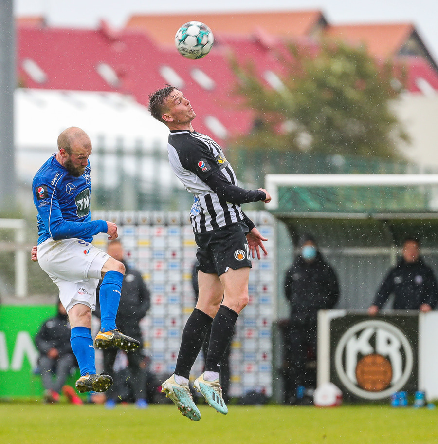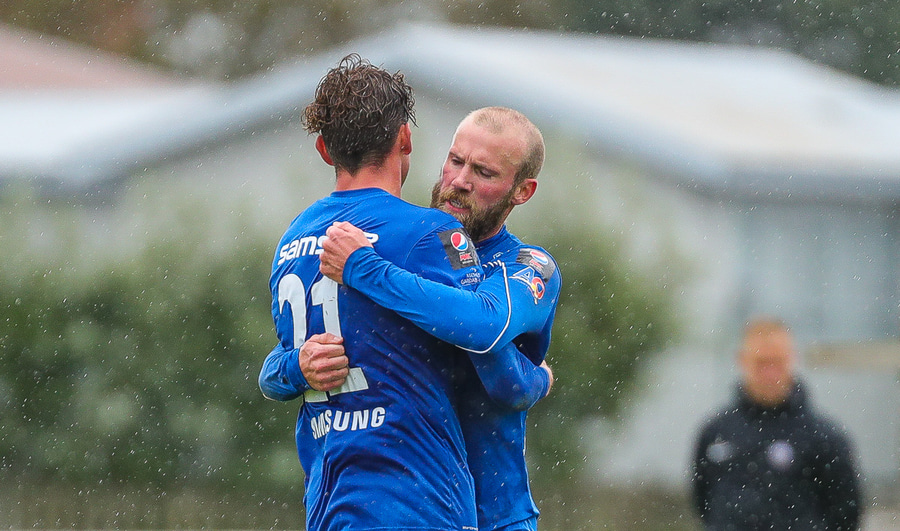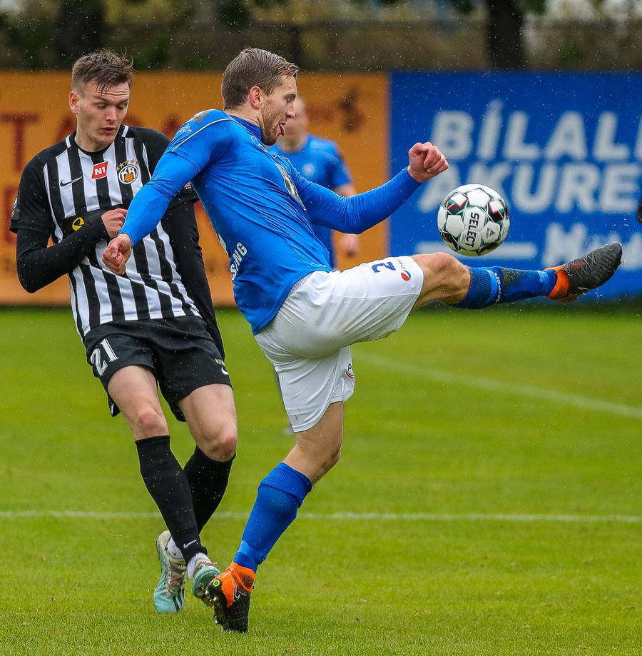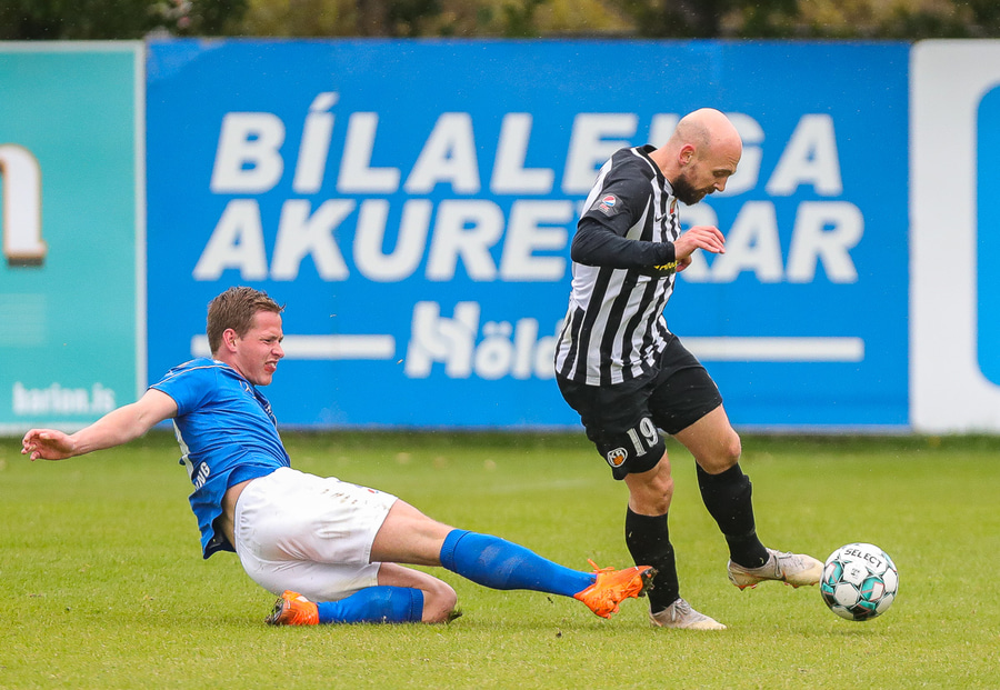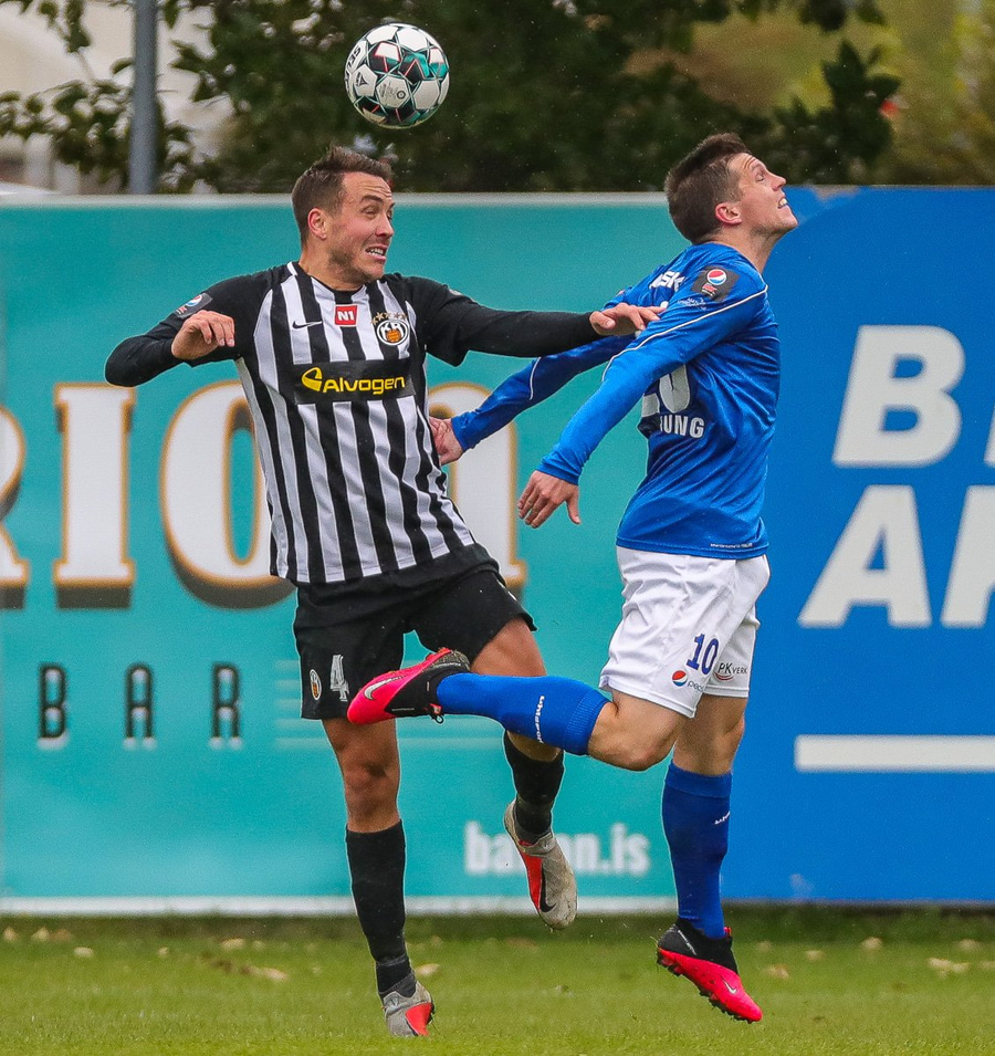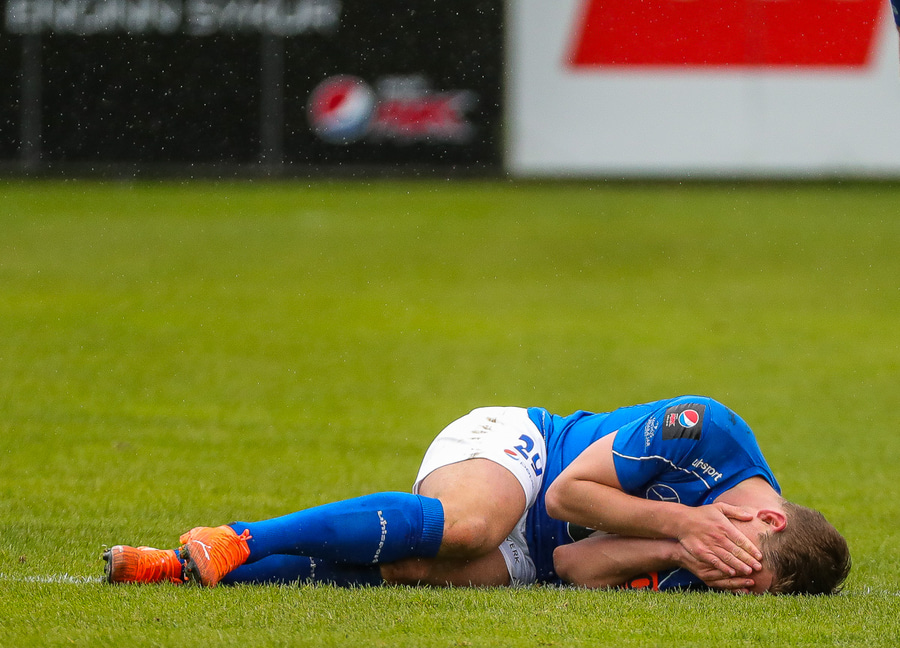 Alex Þór fellur hérna við eftir samstuð við Stefán Árna. Smá sprungin vör en hann harkar þetta af sér.