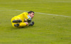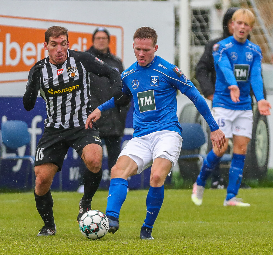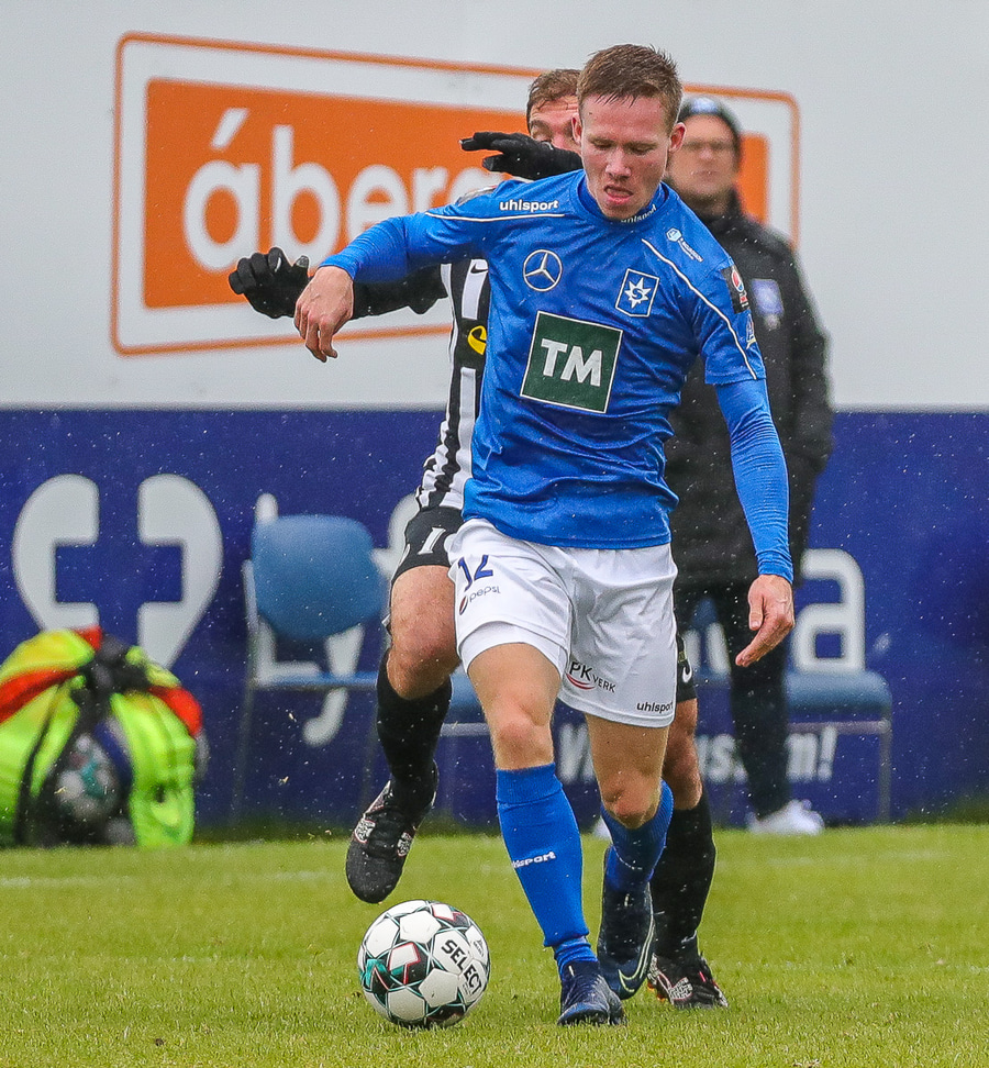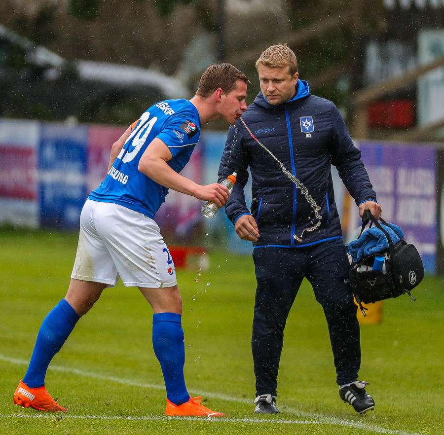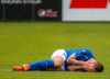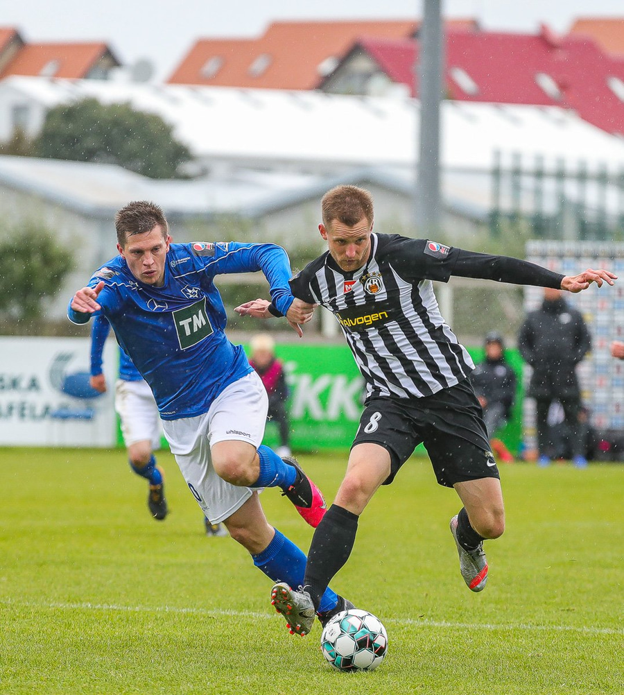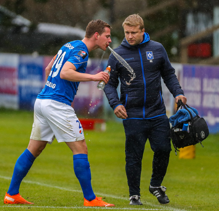 Alex Þór fellur hérna við eftir samstuð við Stefán Árna. Smá sprungin vör en hann harkar þetta af sér.