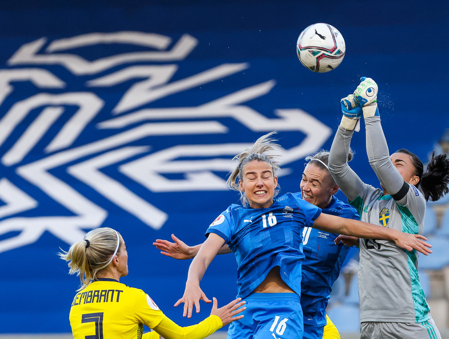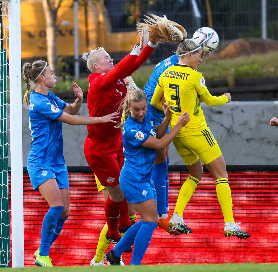 ÚFF Svíar í færi og Ingibjörg liggur eftir. Anderson kemur með sendinguna fyrir frá vinstri og Sandra stekkur hæst og kýlir hann í burtu og lendir á Ingibjörgu.
