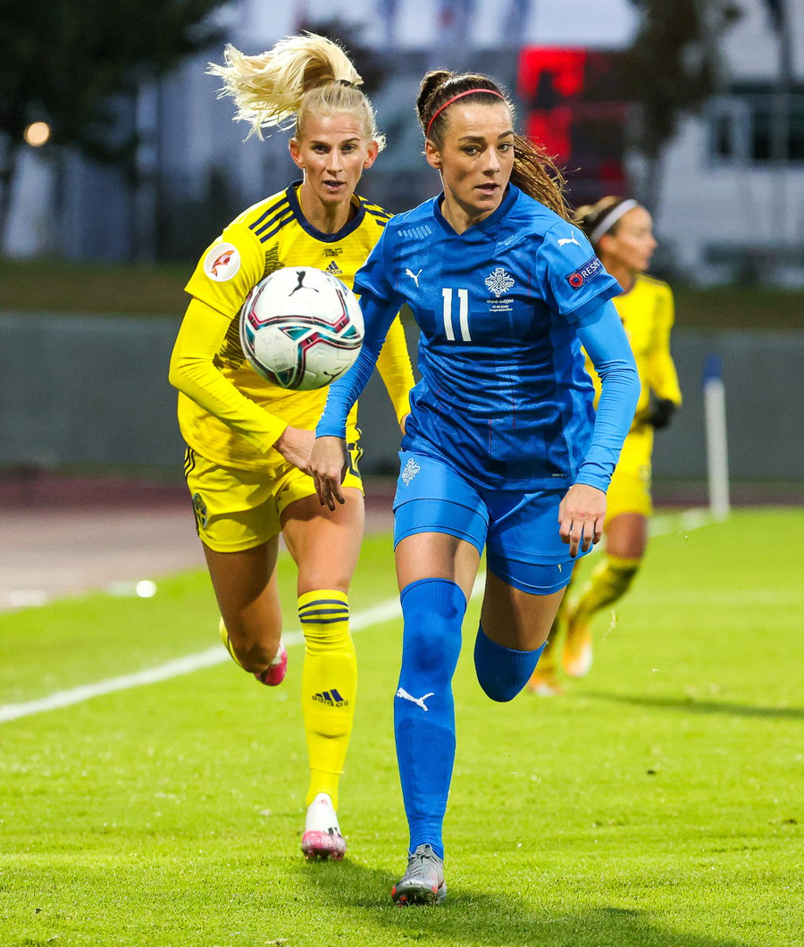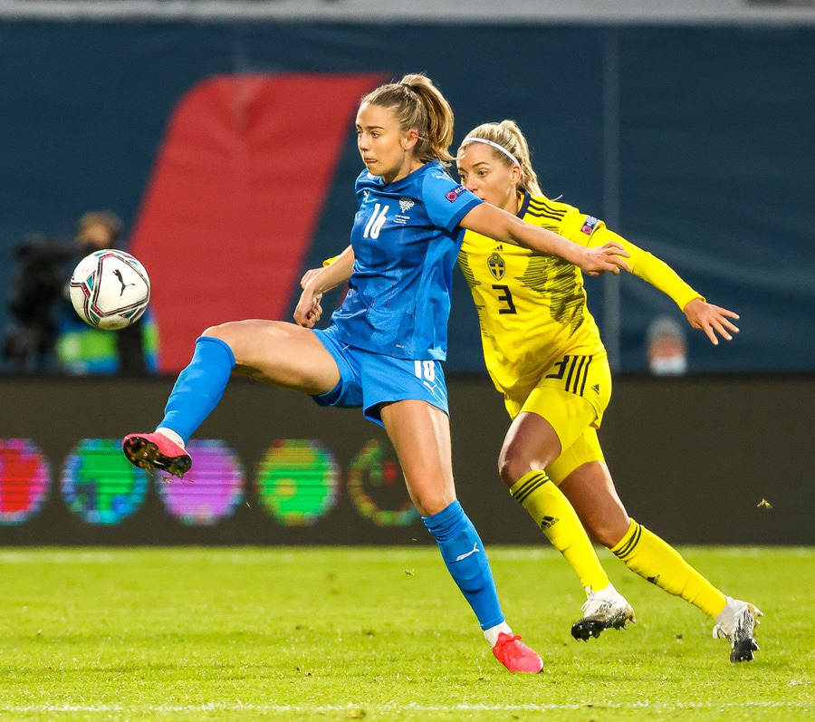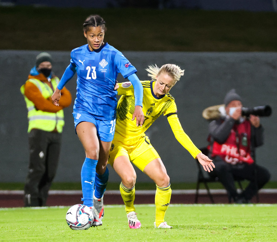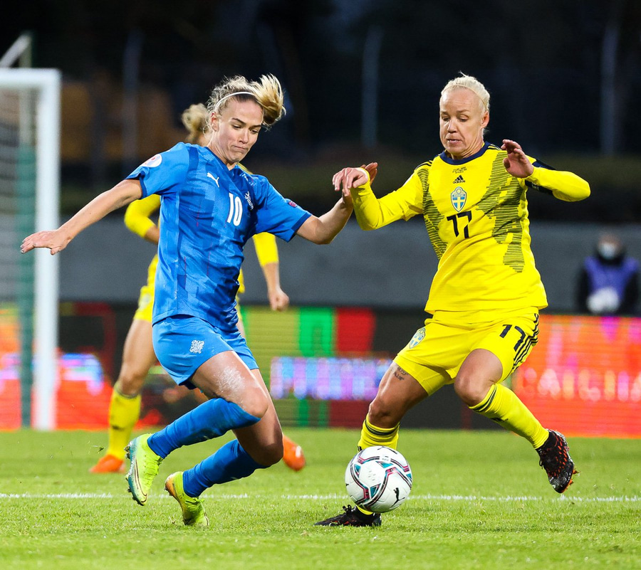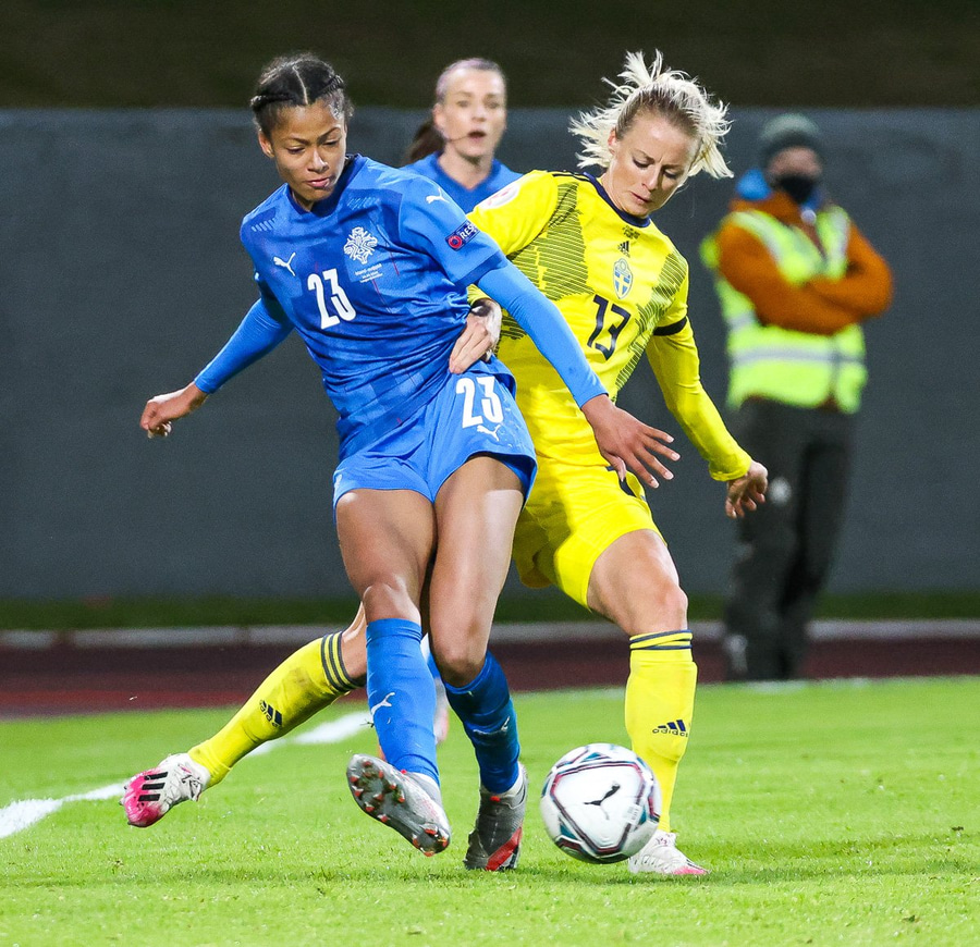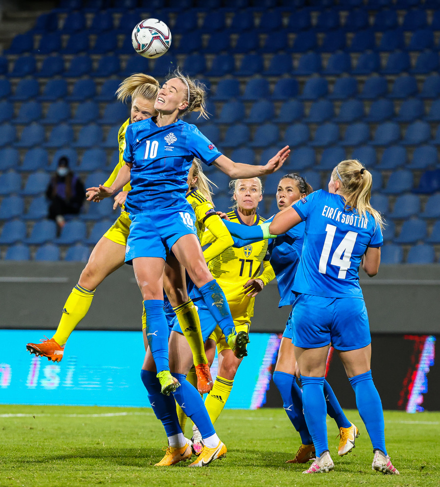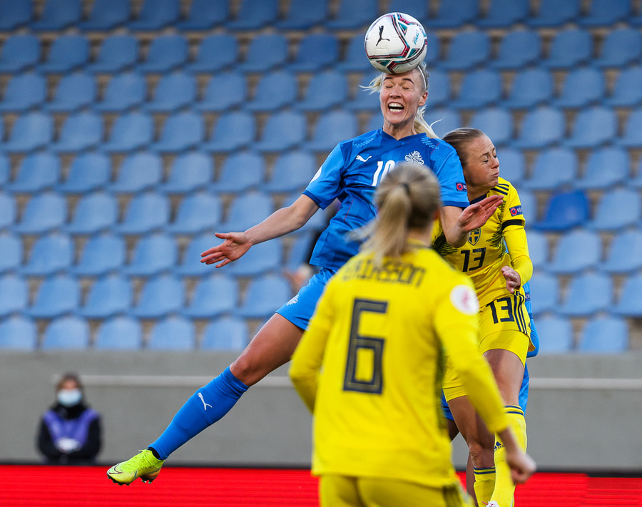 Sveindís vinnur hér innkast eftir frábæra pressu. Svíar skalla svo útaf og við fáum horn sem Hallbera tekur