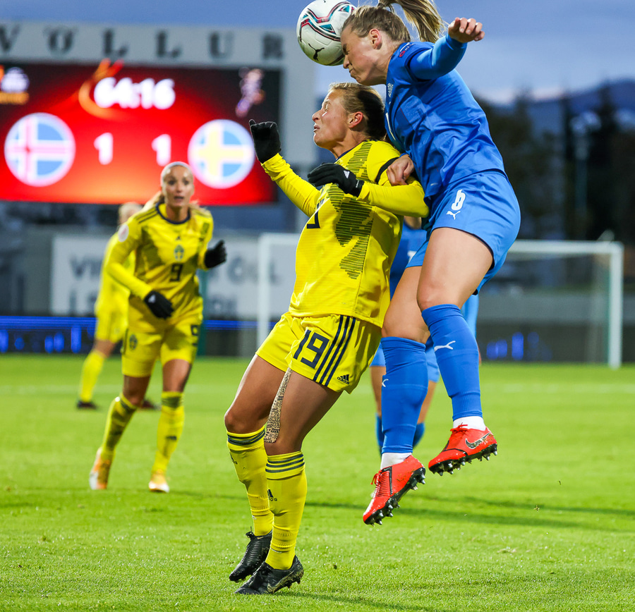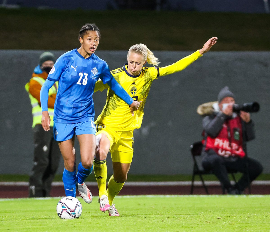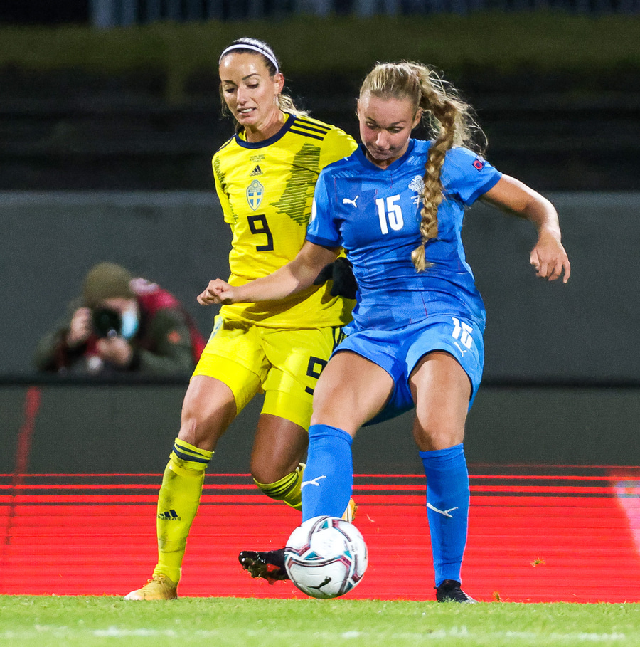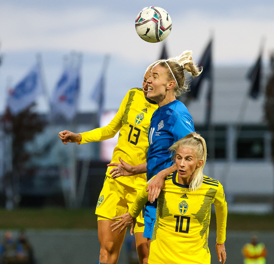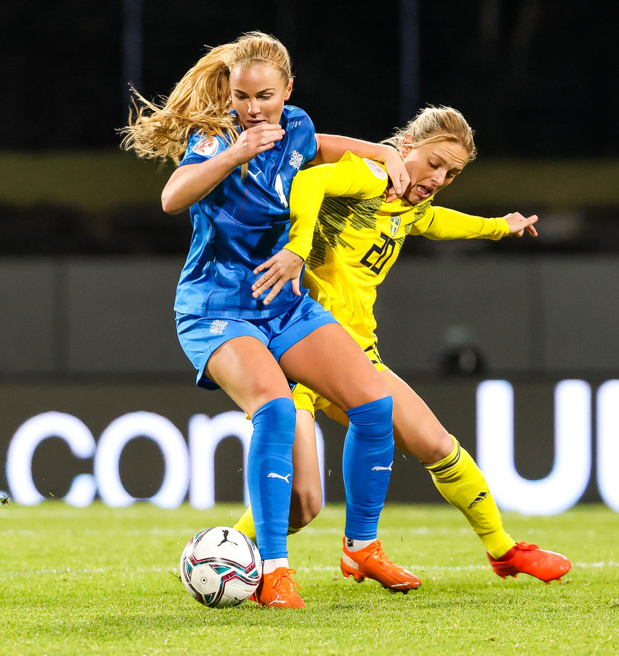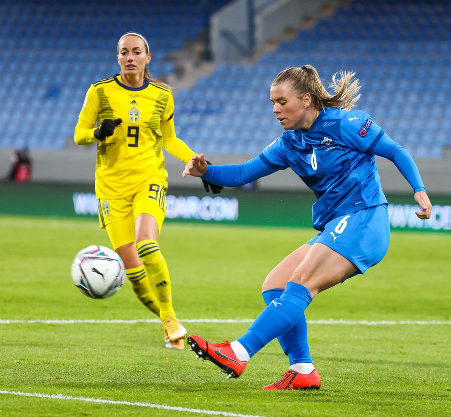Sveindís vinnur hér innkast eftir frábæra pressu. Svíar skalla svo útaf og við fáum horn sem Hallbera tekur