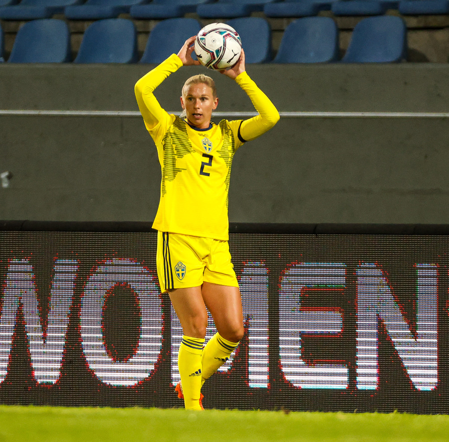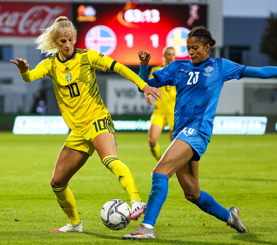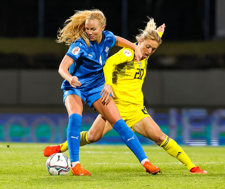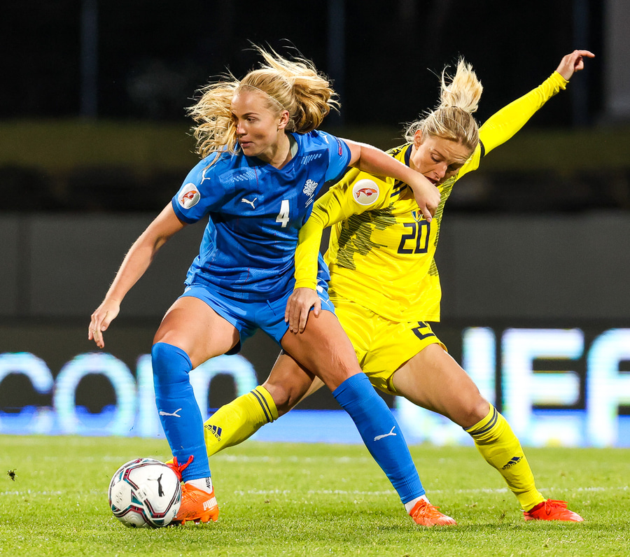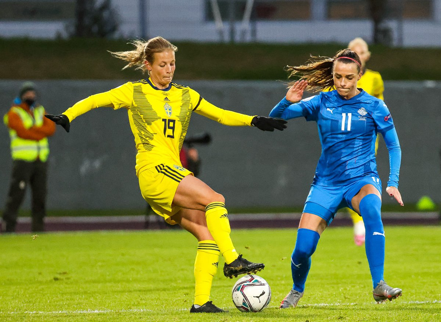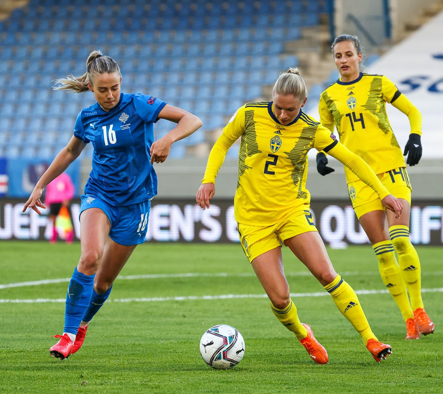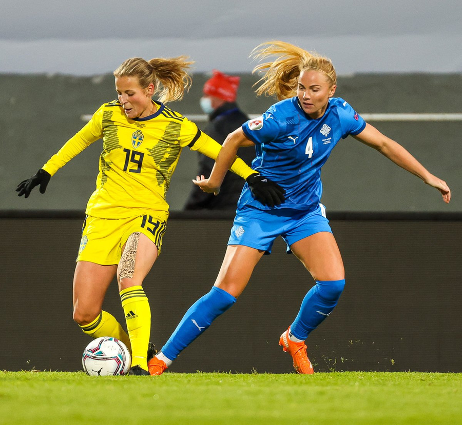 Sveindís vinnur hér innkast eftir frábæra pressu. Svíar skalla svo útaf og við fáum horn sem Hallbera tekur