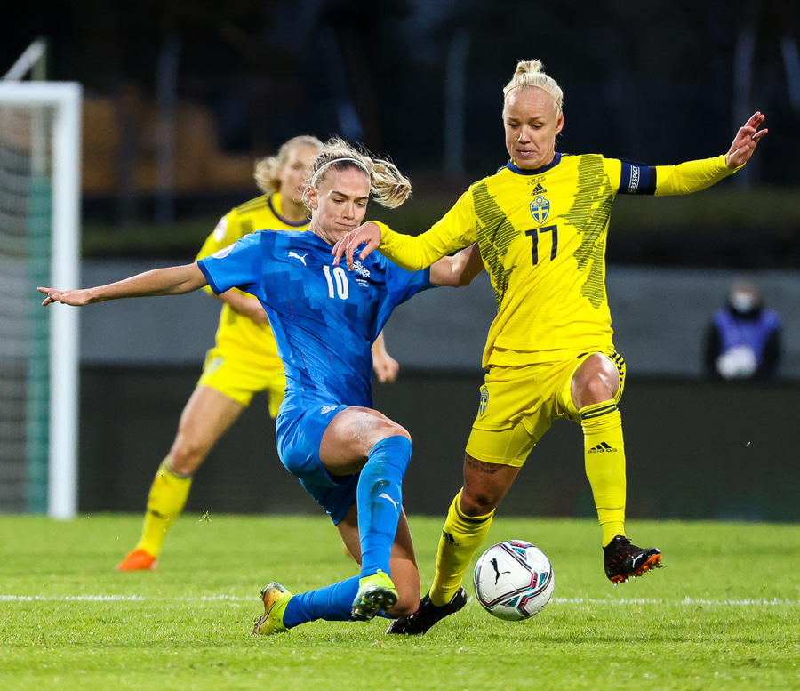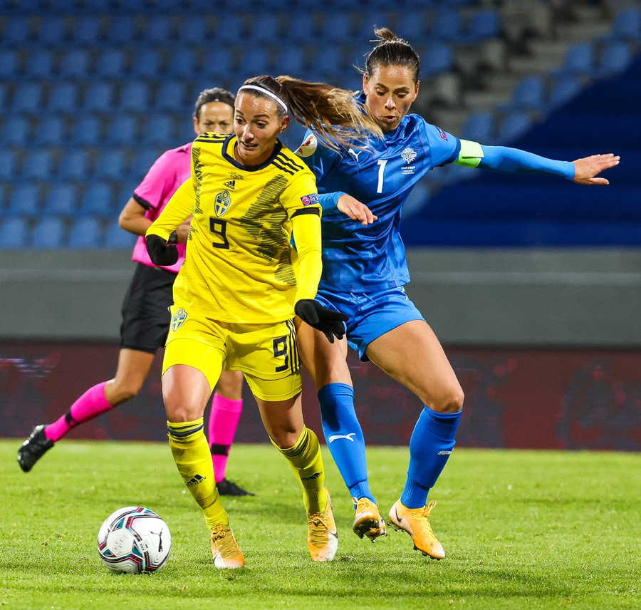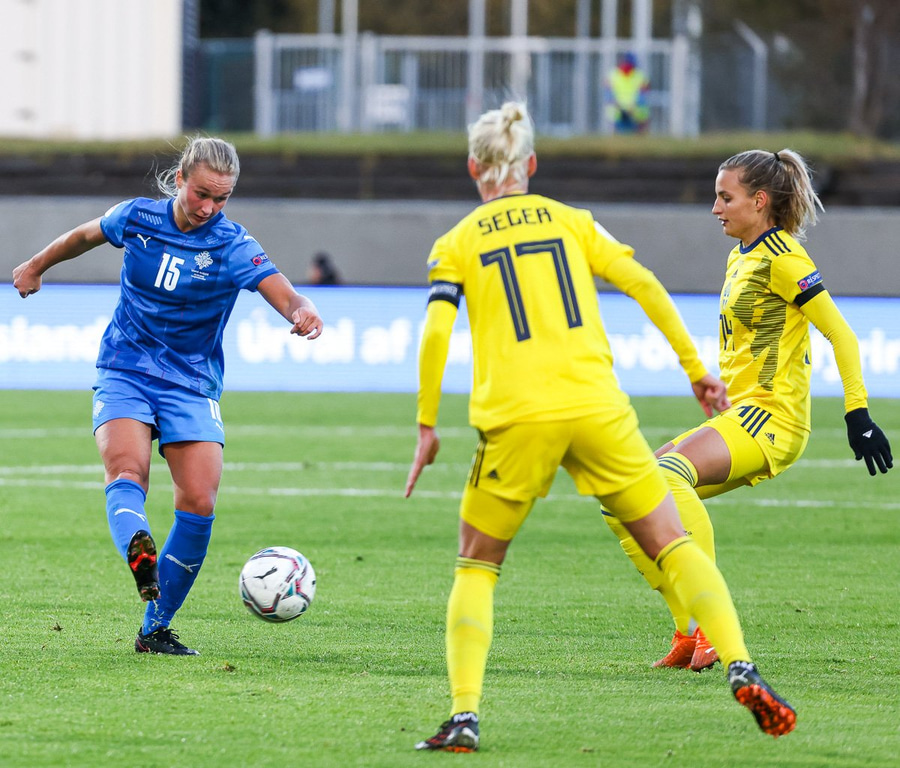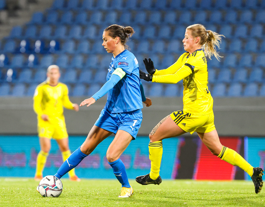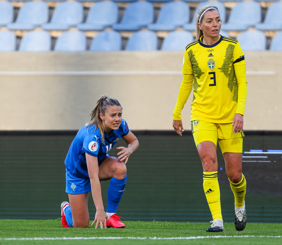 Rétt á eftir voru Íslendingar að gera sig líklega en Dagný rétt missir af boltanum. Sara gerist svo brotleg og Caroline Seger liggur eftir