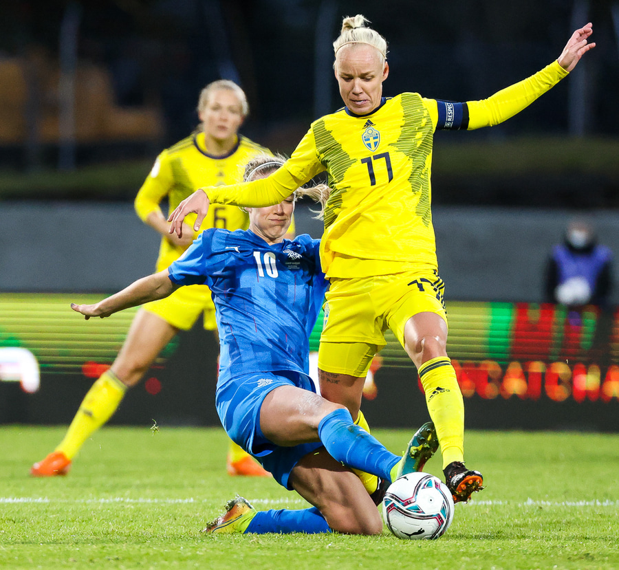 Svíarnir alltaf hættulegar þegar þær komast inn í teig. Larsson reynir að koma boltanum inn í teig en Sara nær að hreinsa