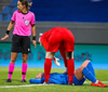 Staðan er 0-1 à hálfleik. Ãslenska liðið jafnaði metin á 42. mÃnútu leiksins en dómari leiksins ákvað á einhvern óskiljanlegan hátt að dæma aukaspyrnu hér!