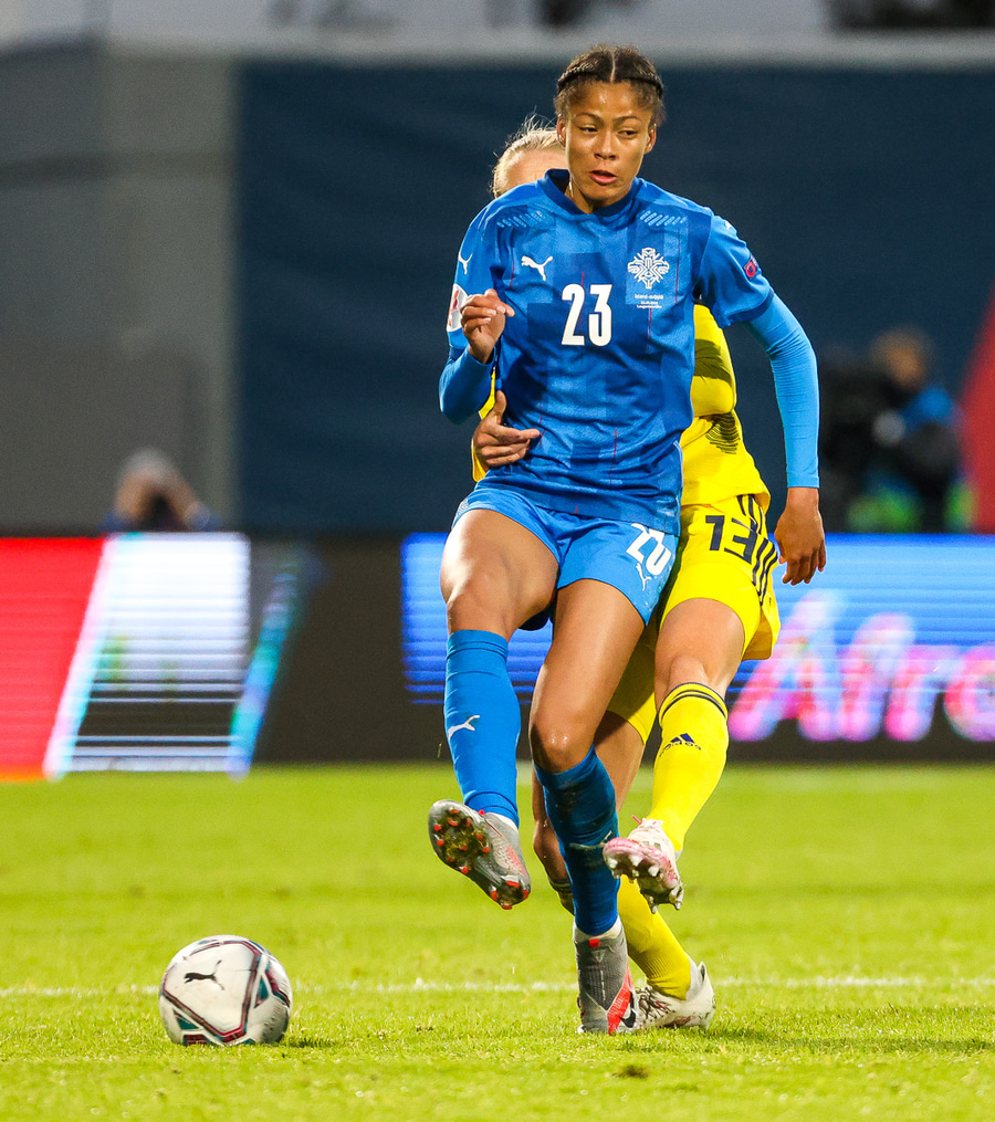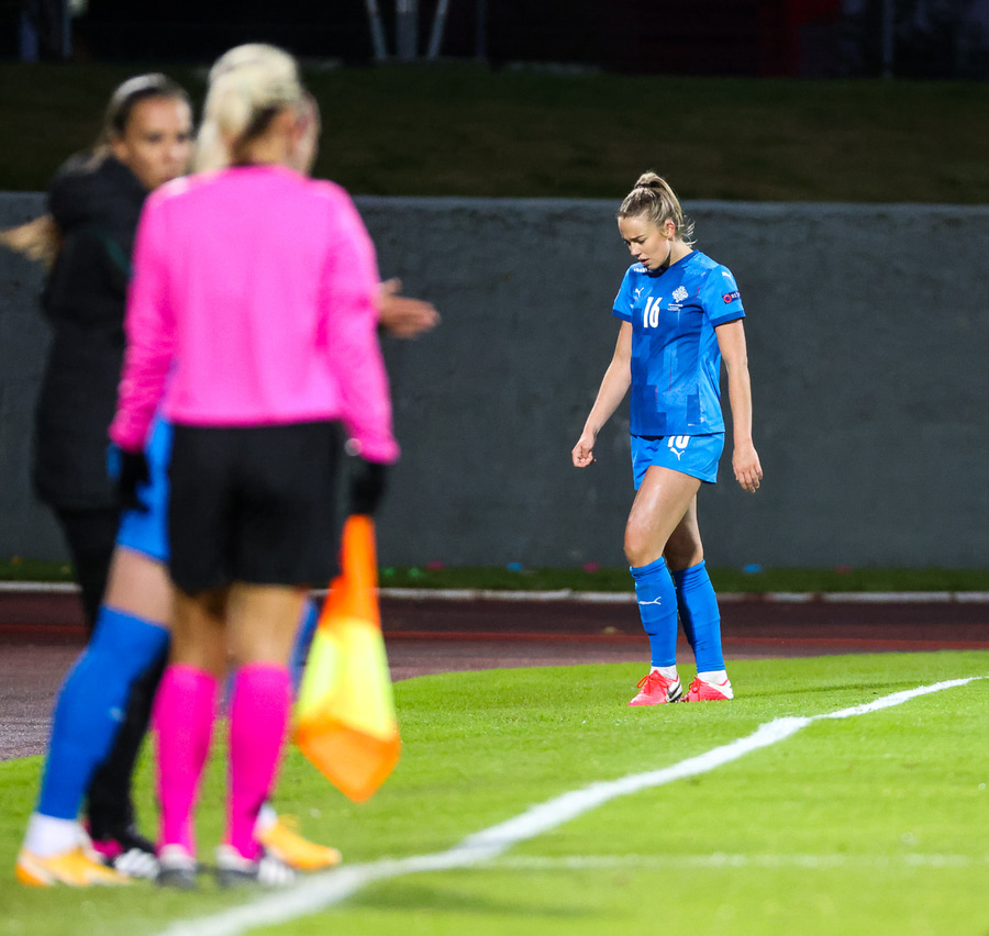 Ef Sveindís hefði dottið hefðum við hugsanlega getað fengið víti, líklega ekki samt miðað við dómgæsluna so far.