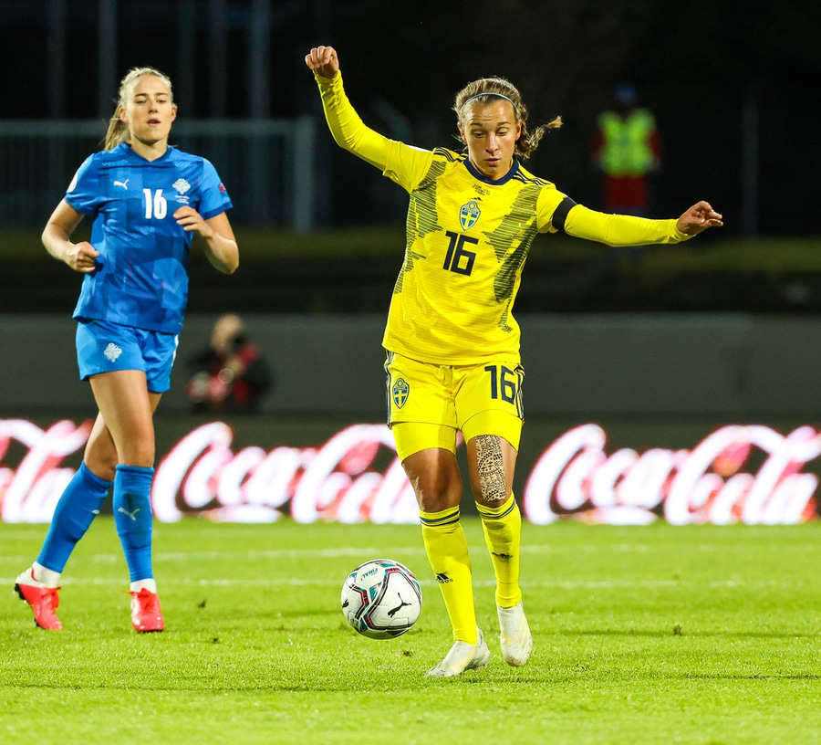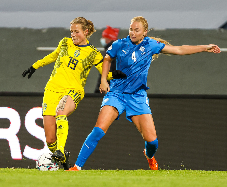 Svíar aðeins að þreifa fyrir sér á vallarhelmingi Íslendinga og fær Joanna fína sendingu inn í teig vinstra megin en Gunnhildur kemur tánni í boltann og hreinsar