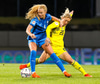 Gunnhildur og Karó að ná vel saman á hægri kantinum eins og í leiknum gegn Lettum. Voru um það bil að spila sig í færi en lokaboltinn frá Gunnhildi ekki nægilega góður og þær gulu hreinsa