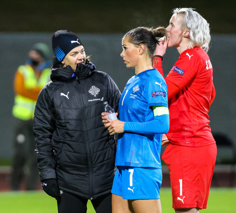 Svava Rós meiddist á æfingu í vikunni en vonir voru bundnar við það að hún næði að vera klár í þennan stórleik. Svo virðist ekki vera þar sem hún þarf að ganga við hækjur eins og þið lesendur getið sér í myndaseríunni hér fyrir ofan