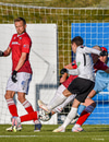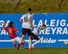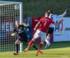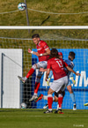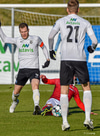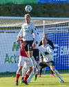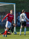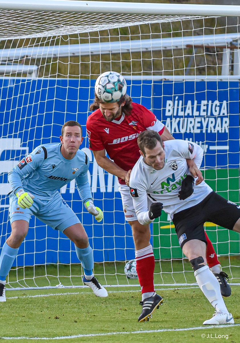 Pétur Viðars með skalla eftir aukaspyrnu en Hannes með það allt á hreinu í markinu.