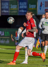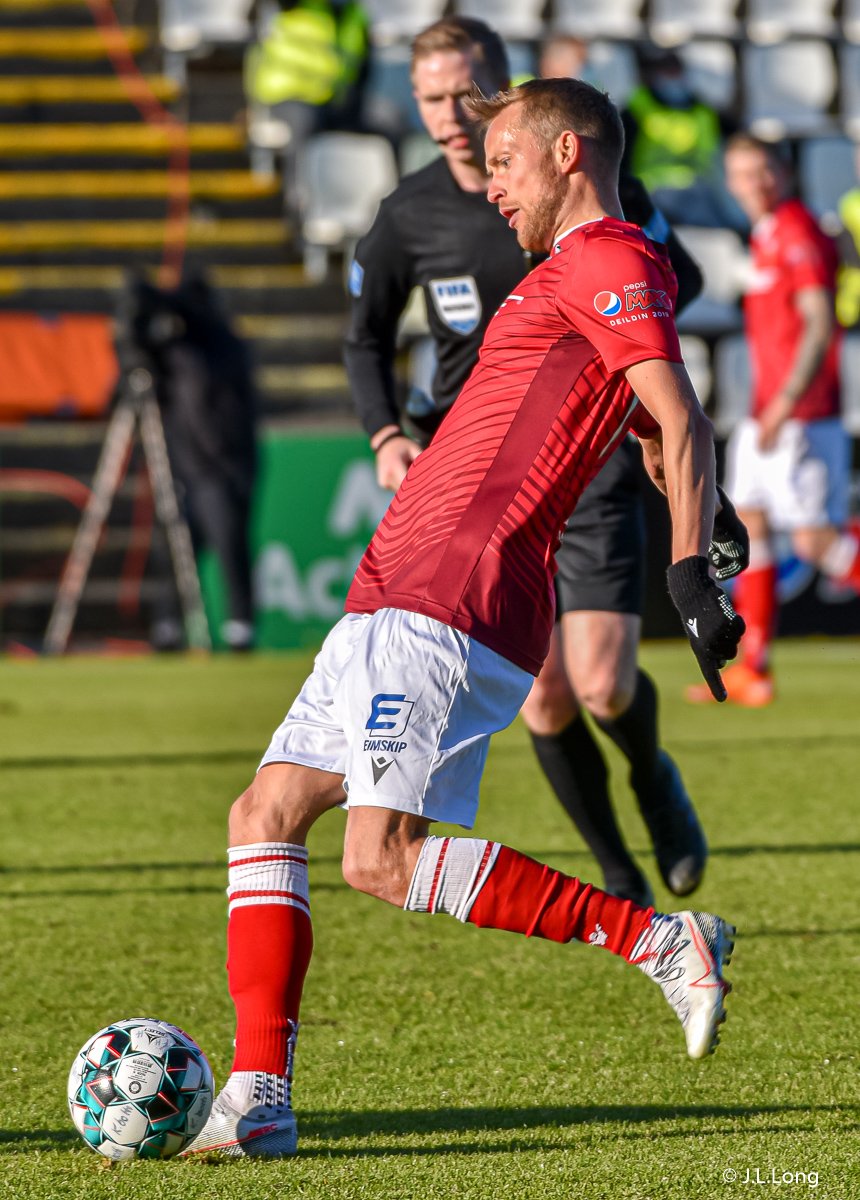 Aron Bjarnason með fyrirgjöf sem heimamenn skalla í horn. Það er að lifna yfir þessu.