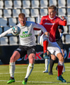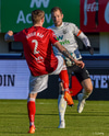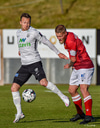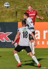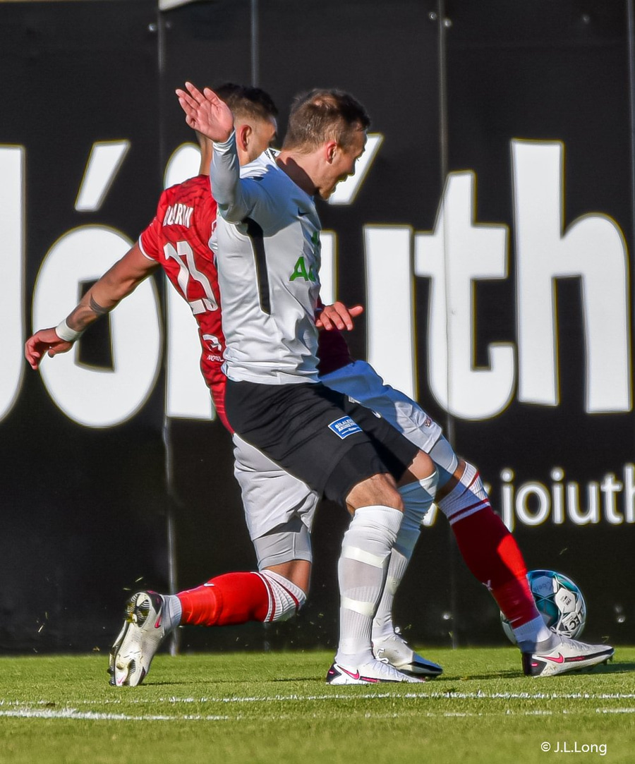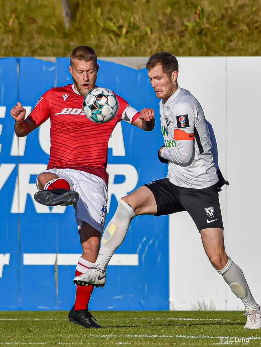 Jóntan Ingi vel hátt með fótinn gegn Lasse Petry sem liggur á miðjum vellinum en stendur upp á meðan Helgi veitir Jónatan smá orð í eyra.