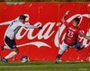 Setur Gunnar í vitlaust horn og skilar boltanum þéttingsfast í hornið..