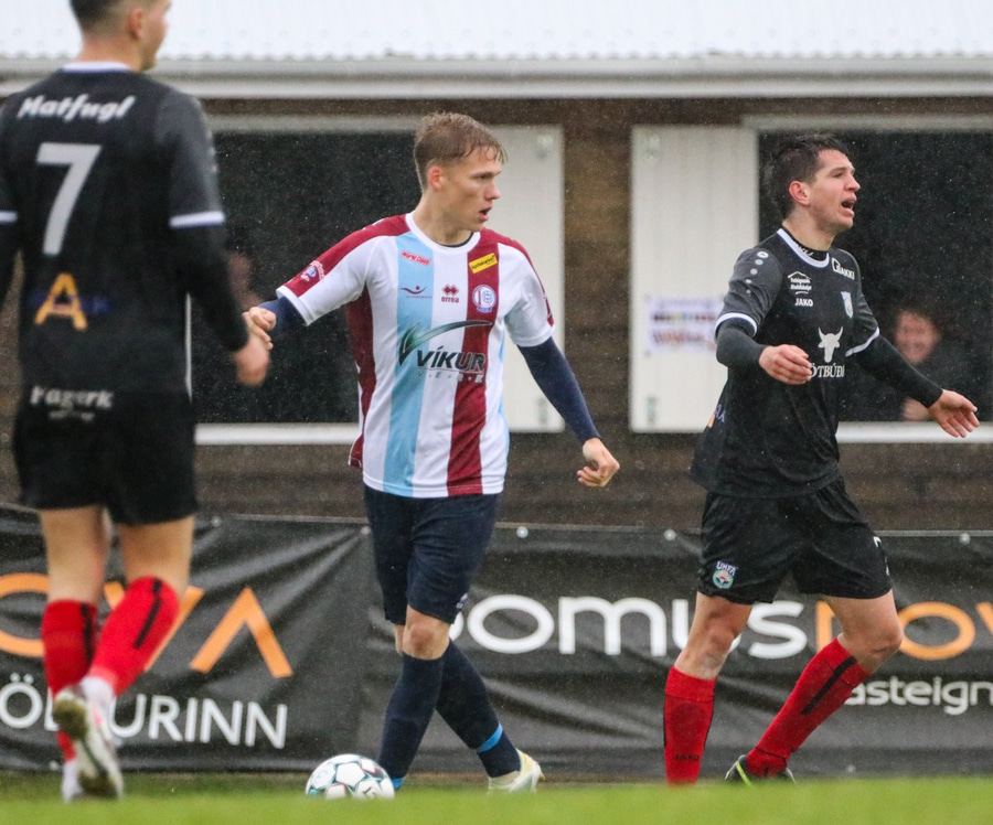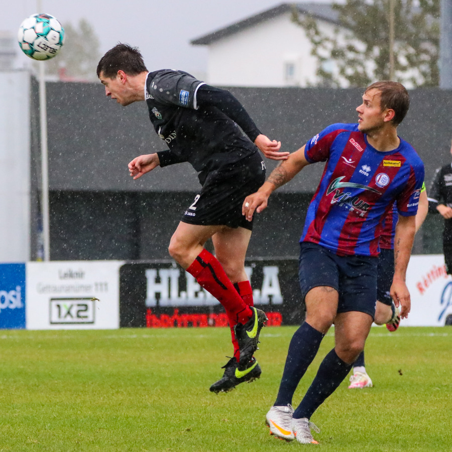 Ale vippar boltanum á fjær og Hafliði skallar framhjá en gestirnir heimta víti, vilja meina að það hafi verið rifið í hann.