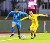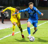 Þessi risastóri leikur er hafinn á Laugardalsvelli. Rúmenía byrjar með boltann!
