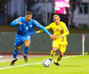 Íslenska liðið leikur í bláa heimabúningnum og rúmenska liðið í gulum búningum.