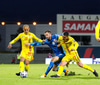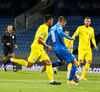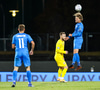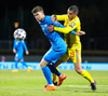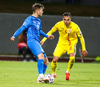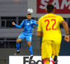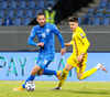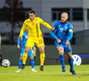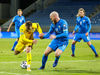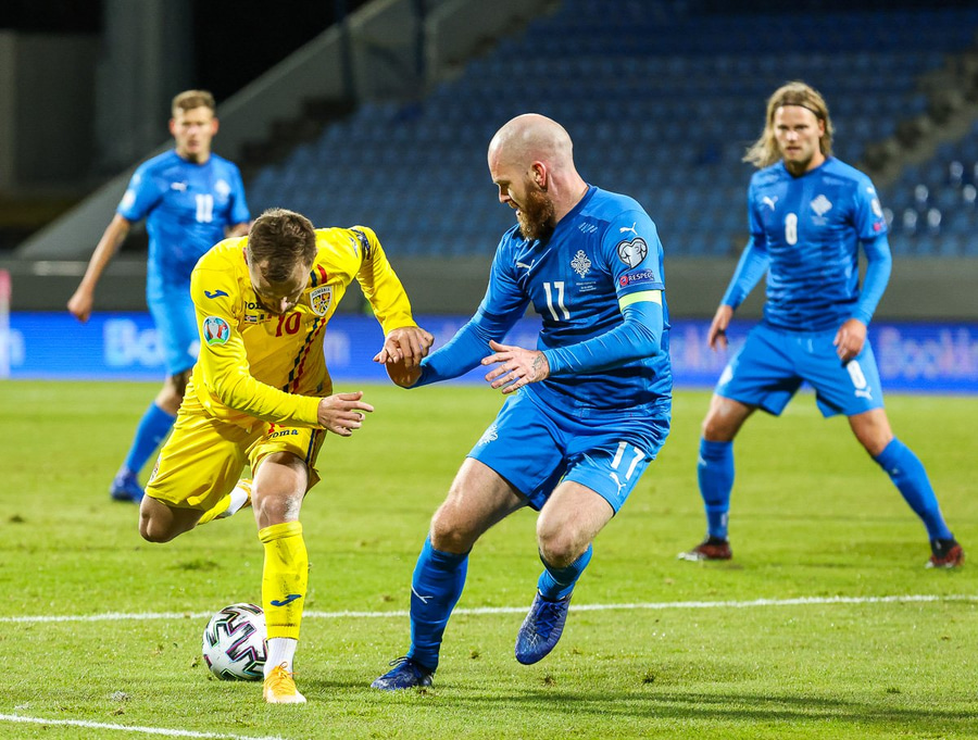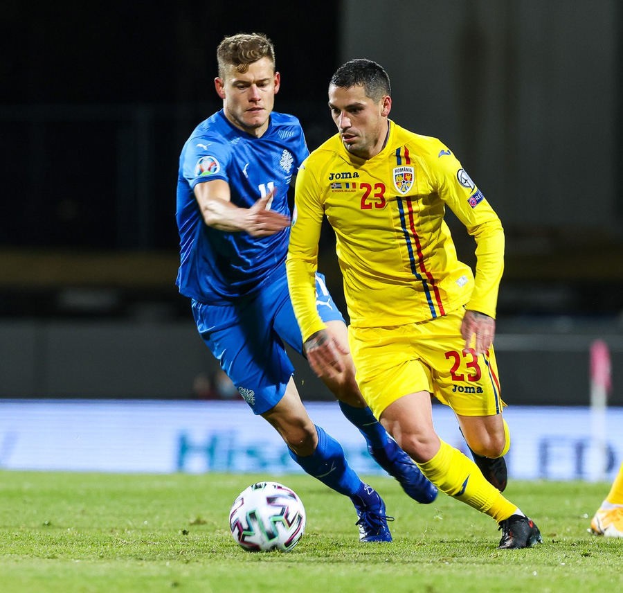 Mitrita stígur inn í Guðlaug Victor og Skomina dæmir aukaspyrnu á Rúmenann. Rúmenar vilja mikið skipta boltanum á vinstri vænginn hjá sér.