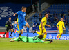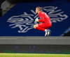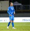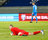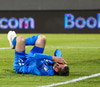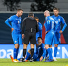 Henti sér niður við vítateig íslenska liðsins og fær gult spjald fyrir leikaraskap.