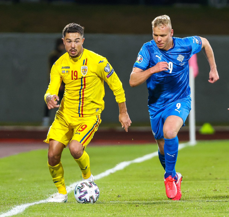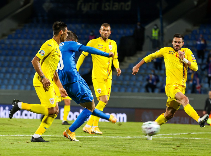 Stanciu með lagleg tilþrif, lætur vaða við vítateiginn og fer skotið af Ragnari og þaðan aftur fyrir. Rúmenía á því horn.