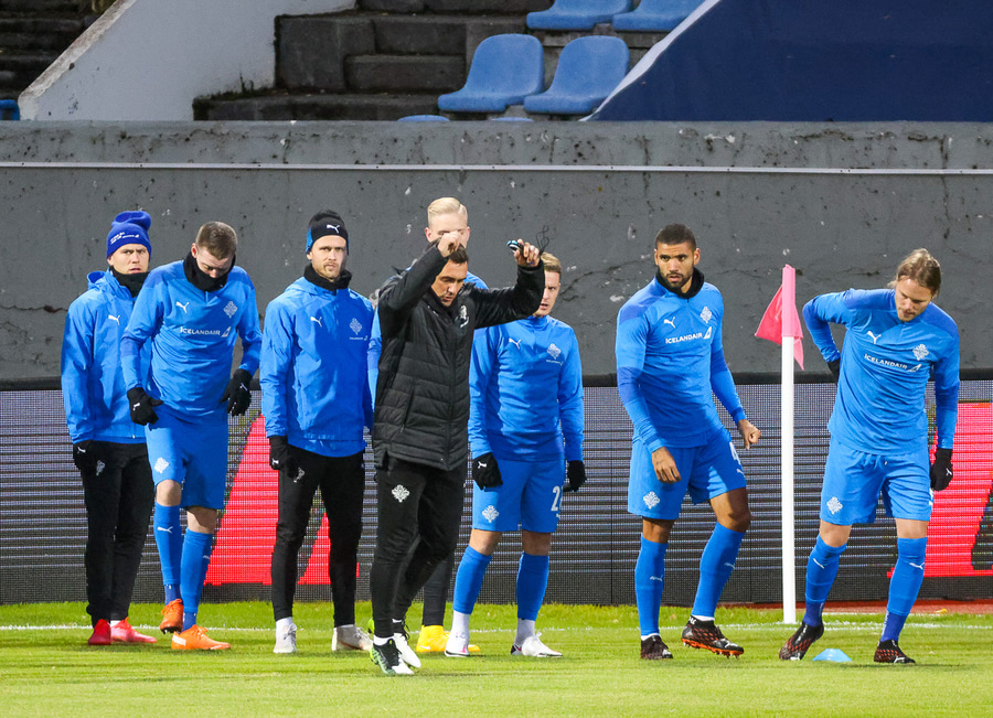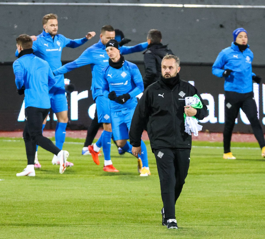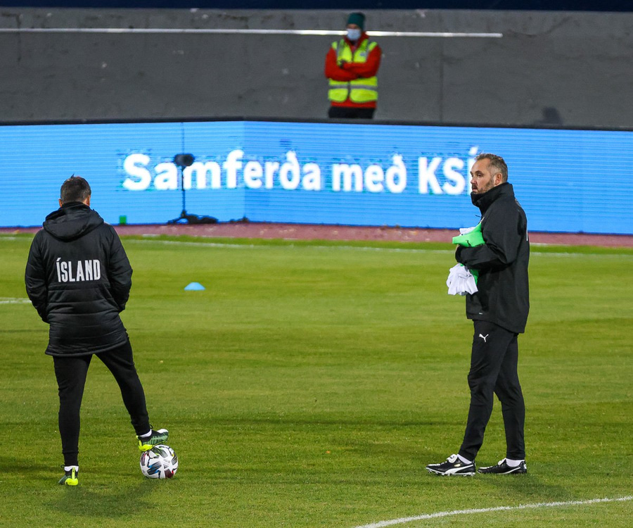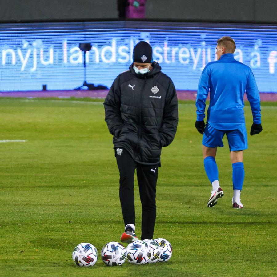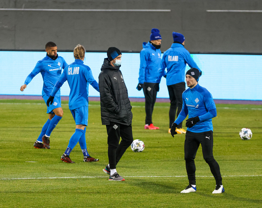 Þeir Erik Hamren og Freyr Alexandersson verða í glerbúri á Laugardalsvelli og stýra því ekki liðinu af hliðarlínunni. Það er vegna þess að þeir eru í sóttkví eftir að smit kom upp í starfsliði íslenska liðsins í gær.