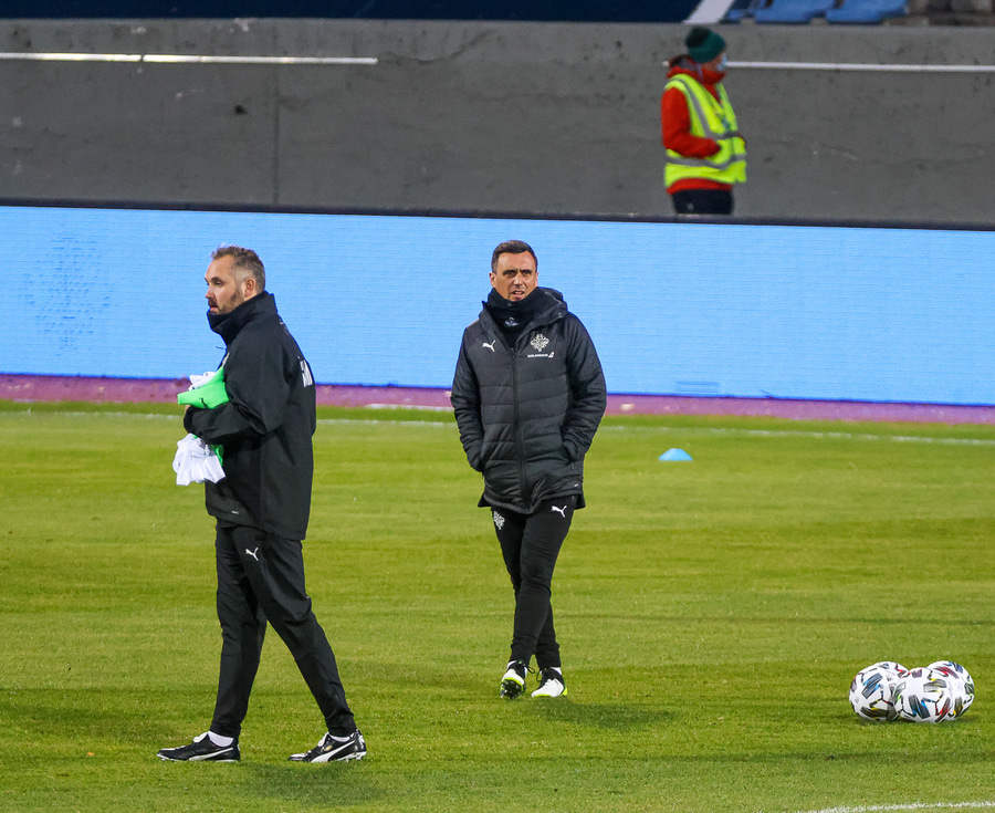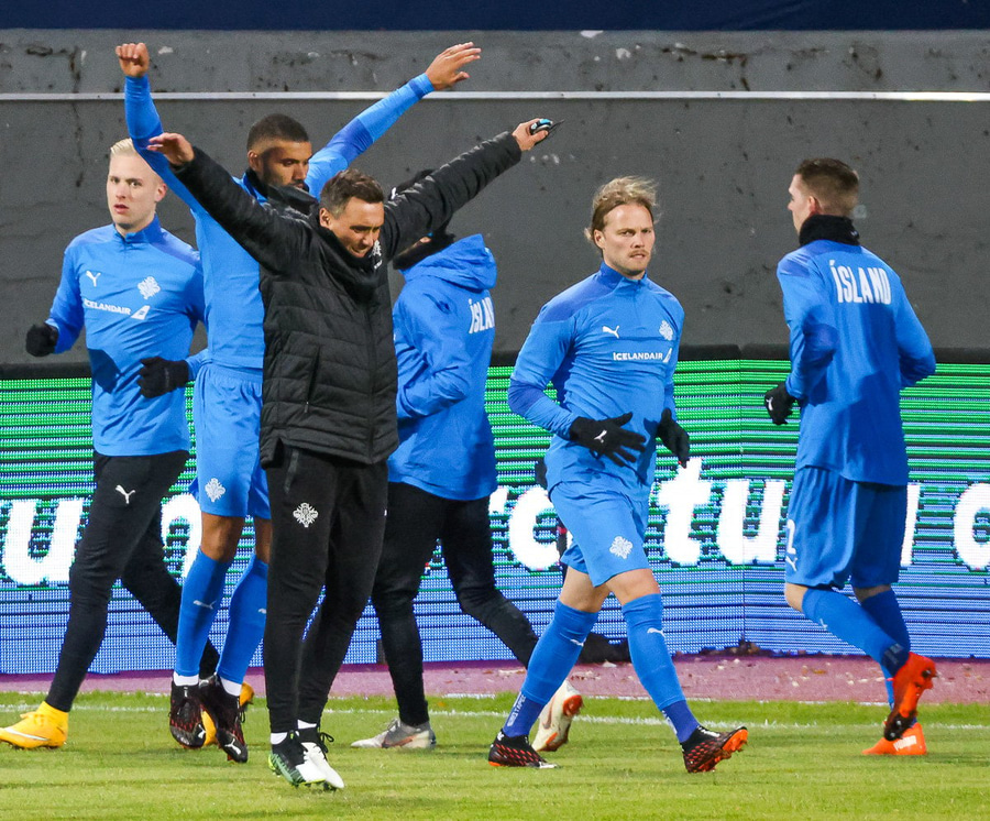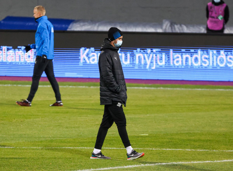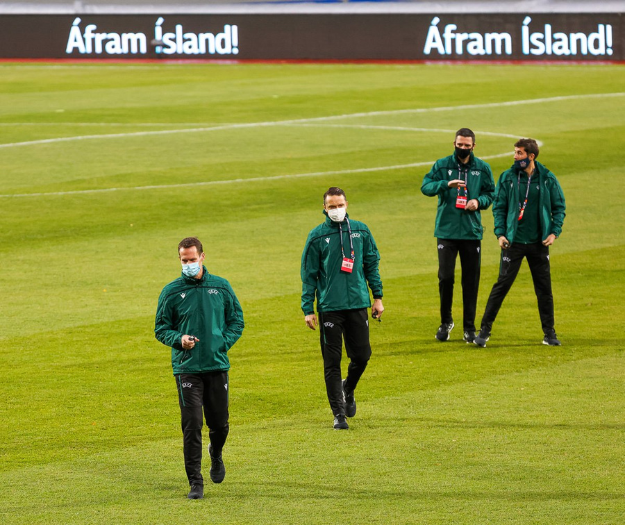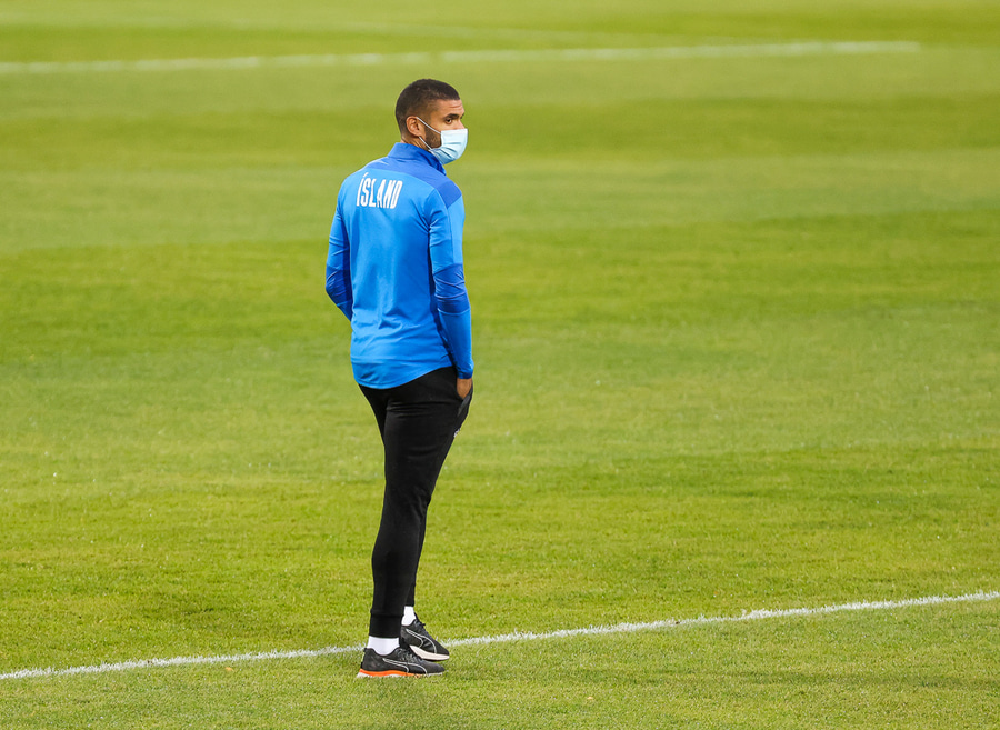 Þeir Erik Hamren og Freyr Alexandersson verða í glerbúri á Laugardalsvelli og stýra því ekki liðinu af hliðarlínunni. Það er vegna þess að þeir eru í sóttkví eftir að smit kom upp í starfsliði íslenska liðsins í gær.