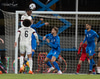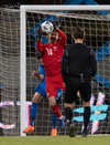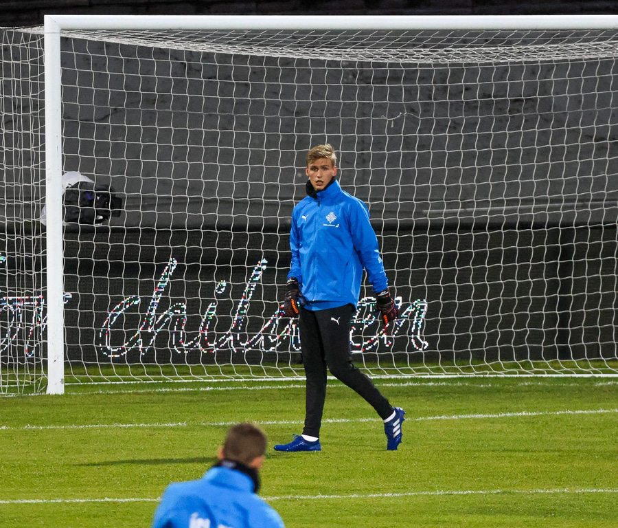 Rúnar Alex kemur fljúgandi úr markinu og grípur þessa fyrirgjöf. Dómari leiksins flautar til hálleiks strax í kjölfarið.