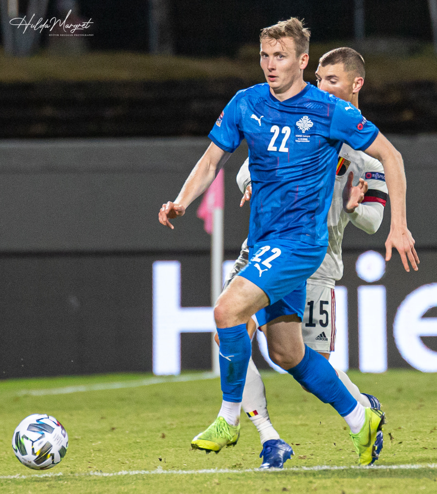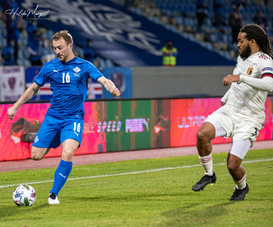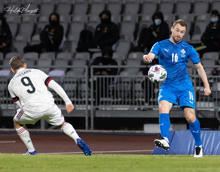 Snörp hjá íslenska liðinu. Boltinn vinnst hátt á vellinum. Albert gerir vel með boltann, finnur Jón Daða sem lætur vaða en skotið beint á Mignolet.