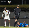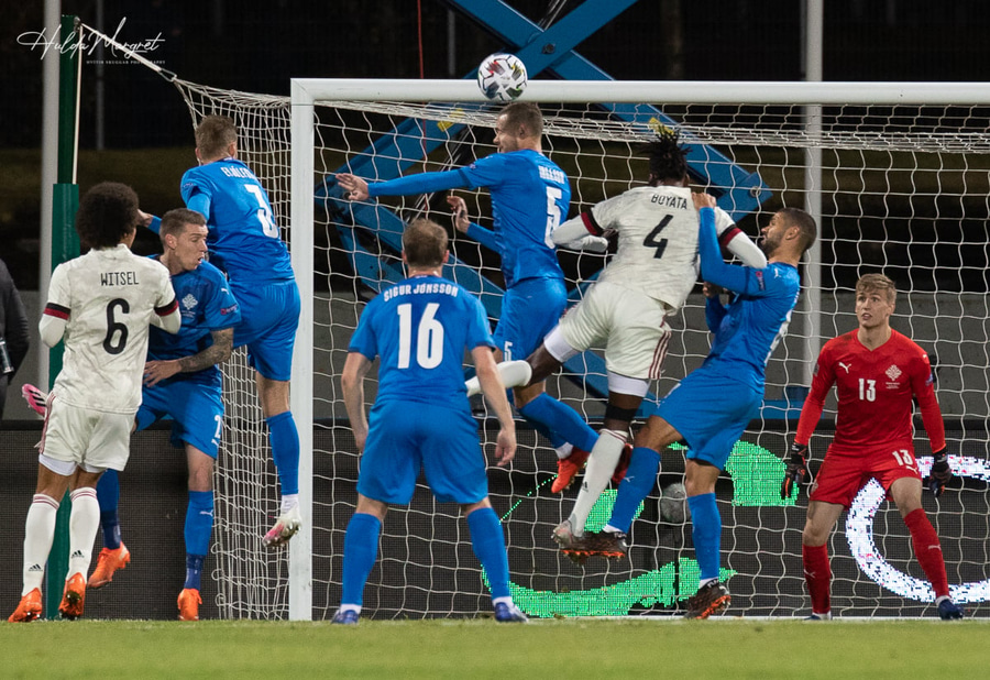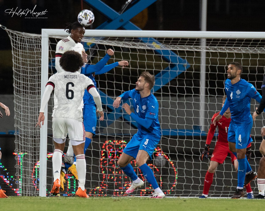 Birkir Már kemst framfyrir Belgann inn á teignum og skallar fyrirgjöf frá hægri í horn - þetta var hætta.