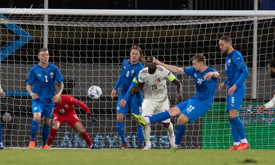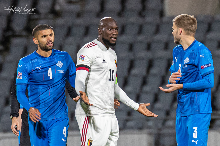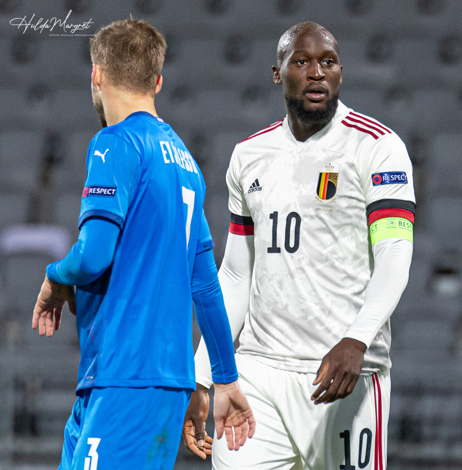 Belgar liggja á íslenska liðinu. Lukaku er illviðráðanlegur þegar hann kemst í boltann. Nánast að það þurfi að þrímenna á manninn.