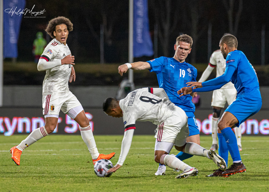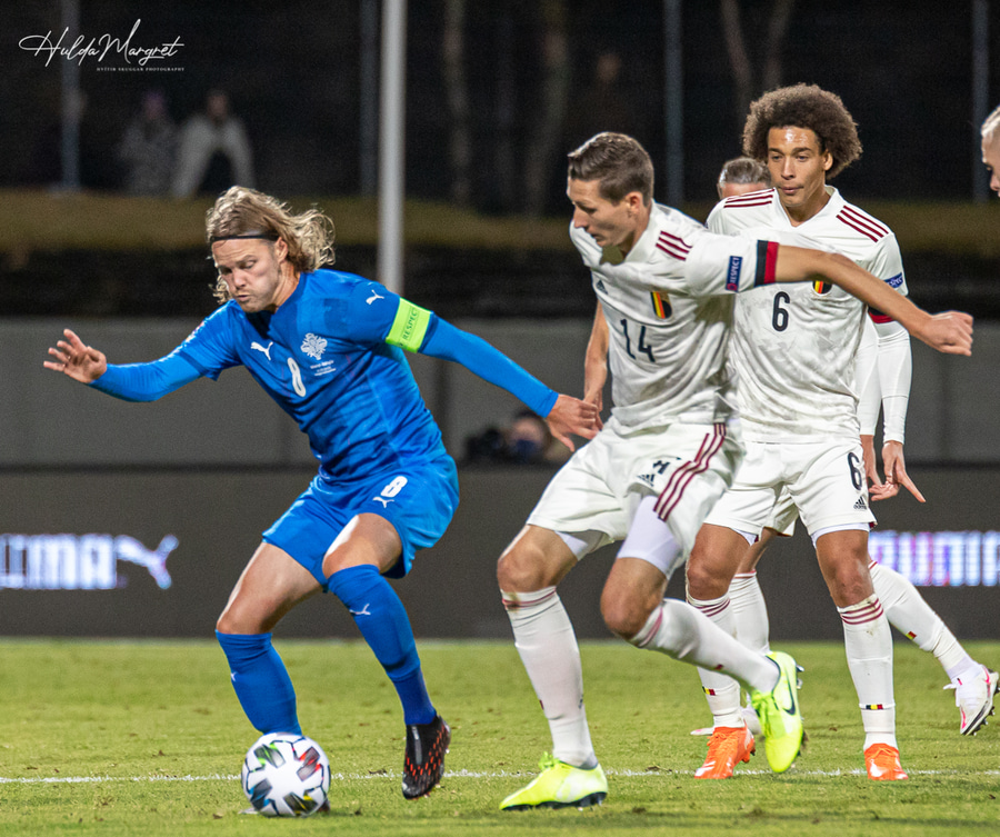 Ari, Birkir og Albert gera vel saman þarna og Witsel brýtur á Alberti. Íslenska liðið full ákaft í langa boltann til að byrja með.