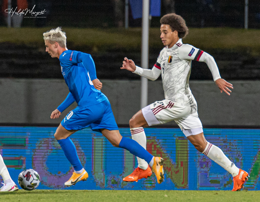 Íslensku leikmennirnir eru farnir inn í klefa. Áður en Albert Guðmundsson gekk inn í klefa þá ræddi hann vel við einn starfsmanna belgíska liðsins.