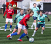 Lee Alexander í bullinu í marki gestanna og fær pressuna frá Elínu á sig. Snýr sér í hringi og nær að koma boltanum út fyrir hliðarlínu að lokum.