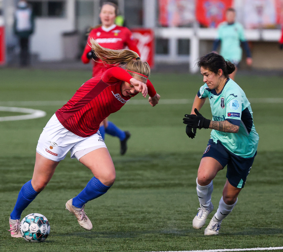 Þær þurftu þó að hafa fyrir því að komast í þennan leik gegn Val en í fyrstu umferð forkeppninar mættu þær liði Peamount United frá Írlandi og höfðu að lokum 6-5 sigur eftir vítaspyrnukeppni.