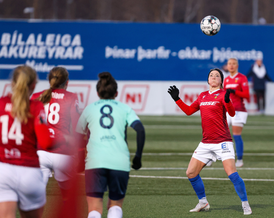 Elín Metta gerir vel úti vinstra meginn og nær boltanum fyrir markið, þar grípur þó Lee í marki gestanna inní.