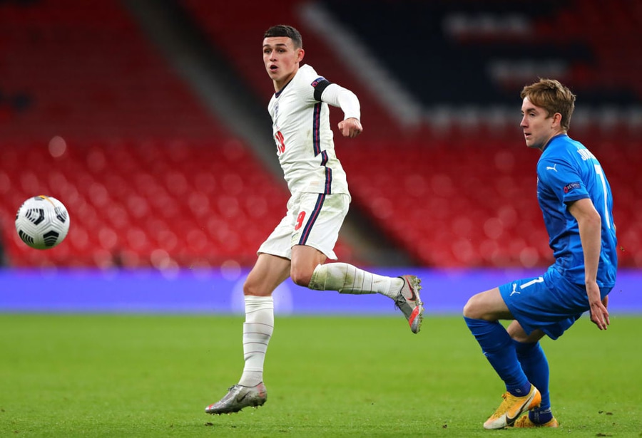 Foden næstum því búinn að skora sitt fyrst landsliðsmark en Ögmundur kemur vel út á móti honum og nær að loka.