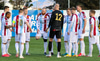 Liðin eru mætt út á völl og eru byrjuð að hita upp. Rétt rúmur hálftími í upphafsflautið.