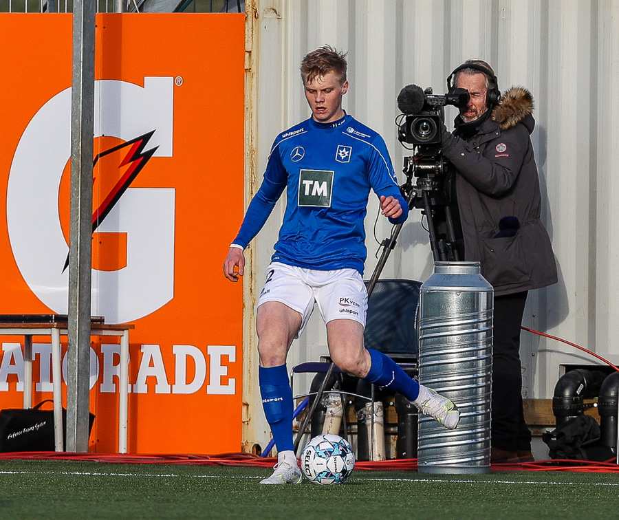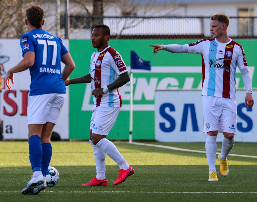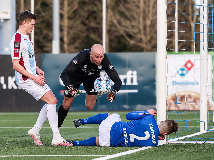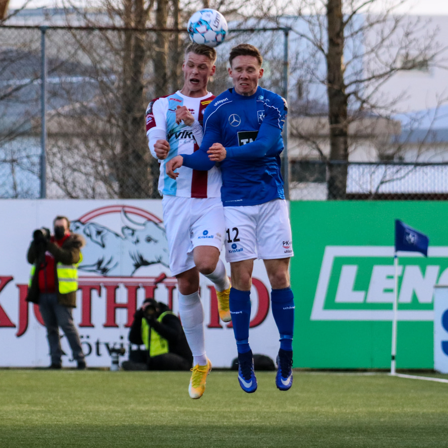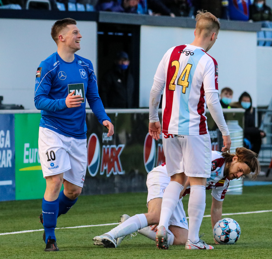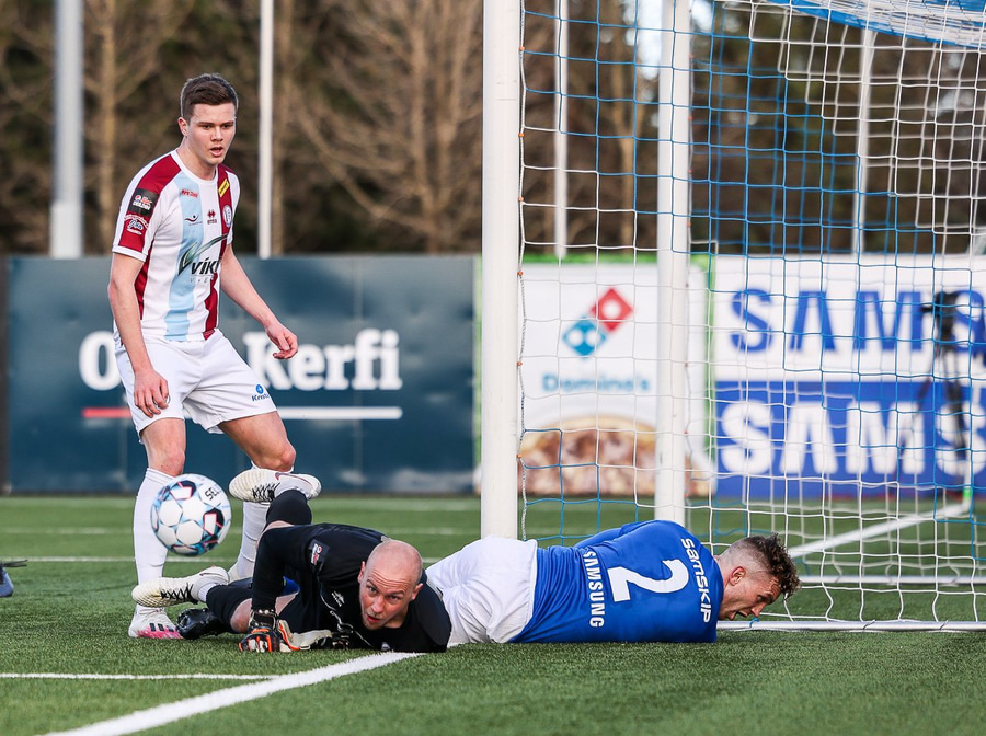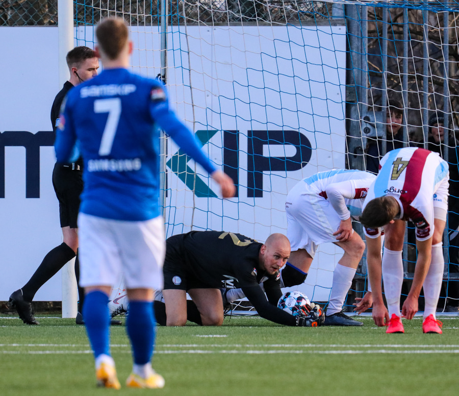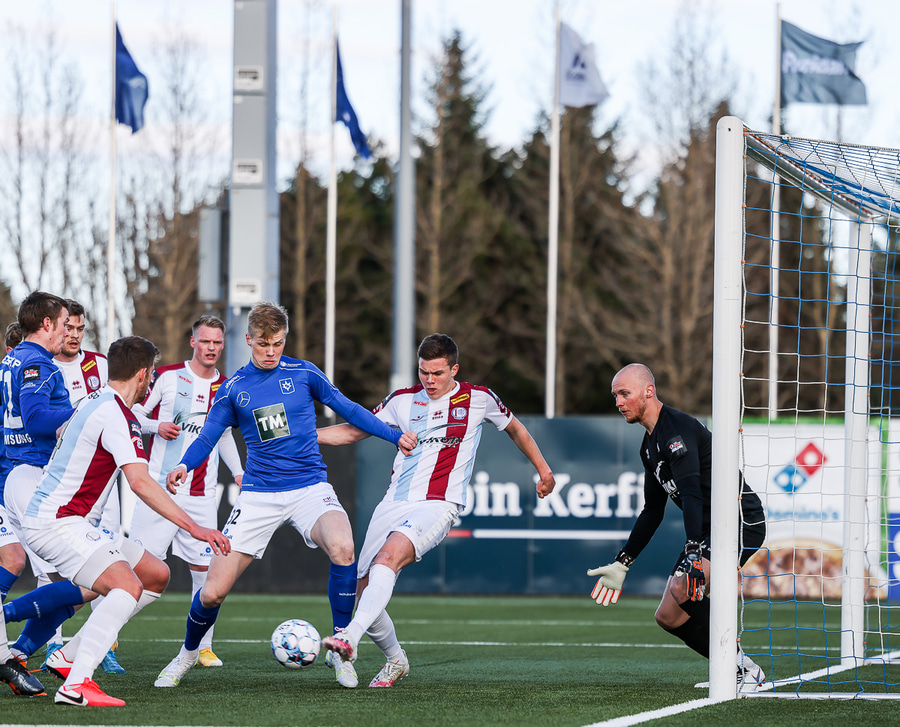 Tristan fær boltann hægra meginn og færir boltann yfir á Kristó Konráðs sem kemur með fyrirgjöf á Emil Atlason sem nær að halda boltanum inn á og reynir að koma með boltann út í teiginn en Smit grípur boltann.