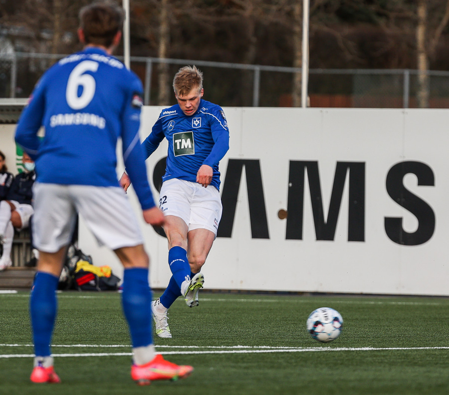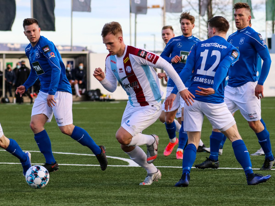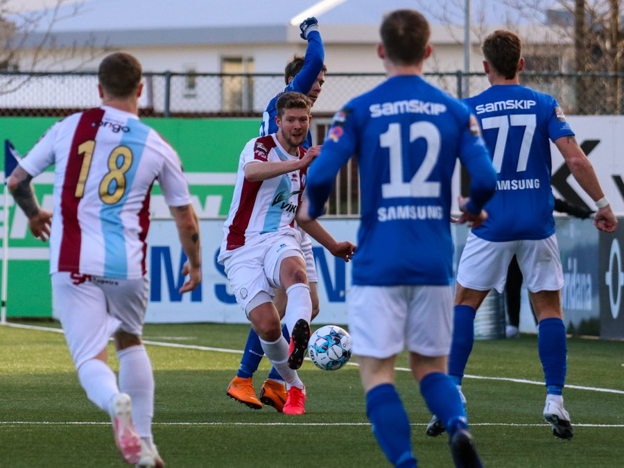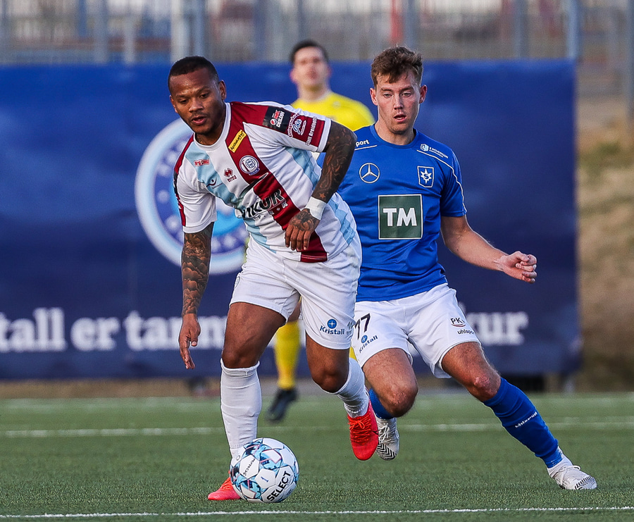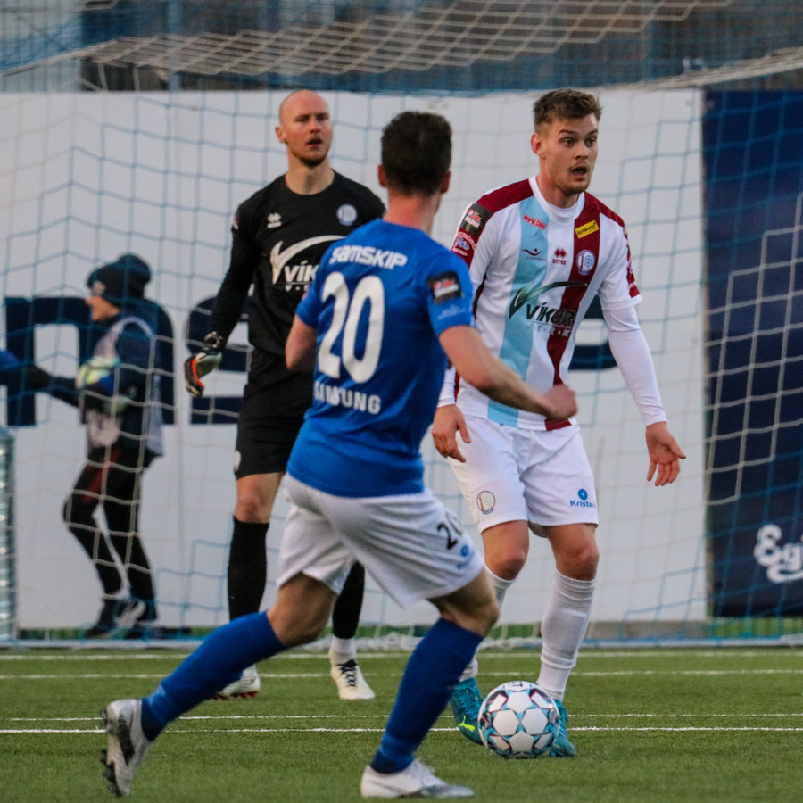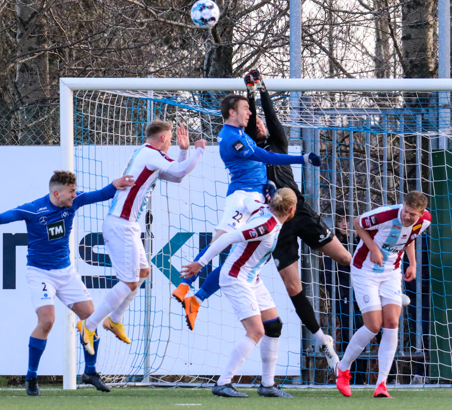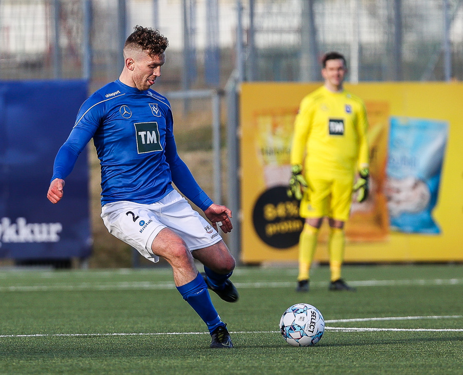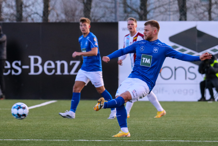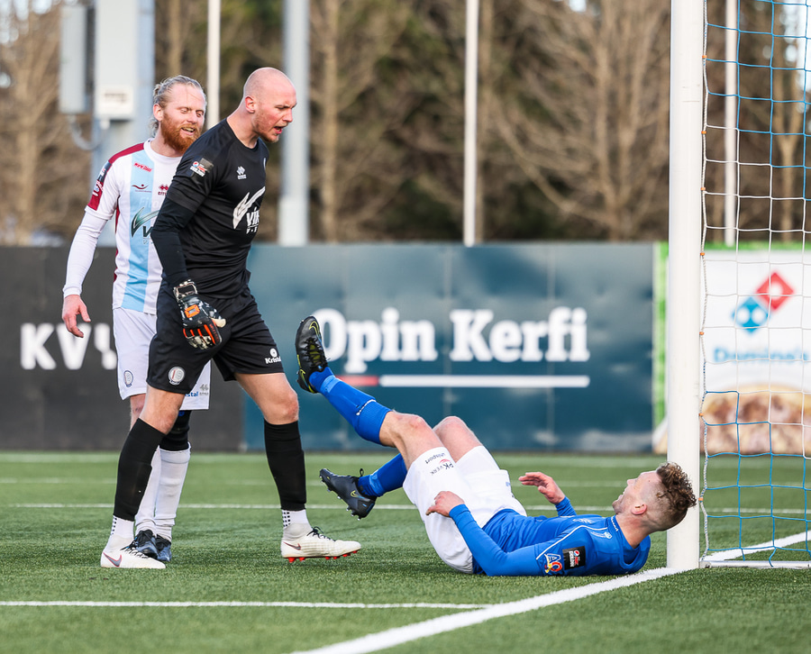 Tristan fær boltann hægra meginn og færir boltann yfir á Kristó Konráðs sem kemur með fyrirgjöf á Emil Atlason sem nær að halda boltanum inn á og reynir að koma með boltann út í teiginn en Smit grípur boltann.