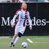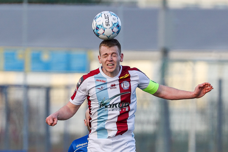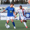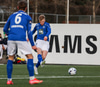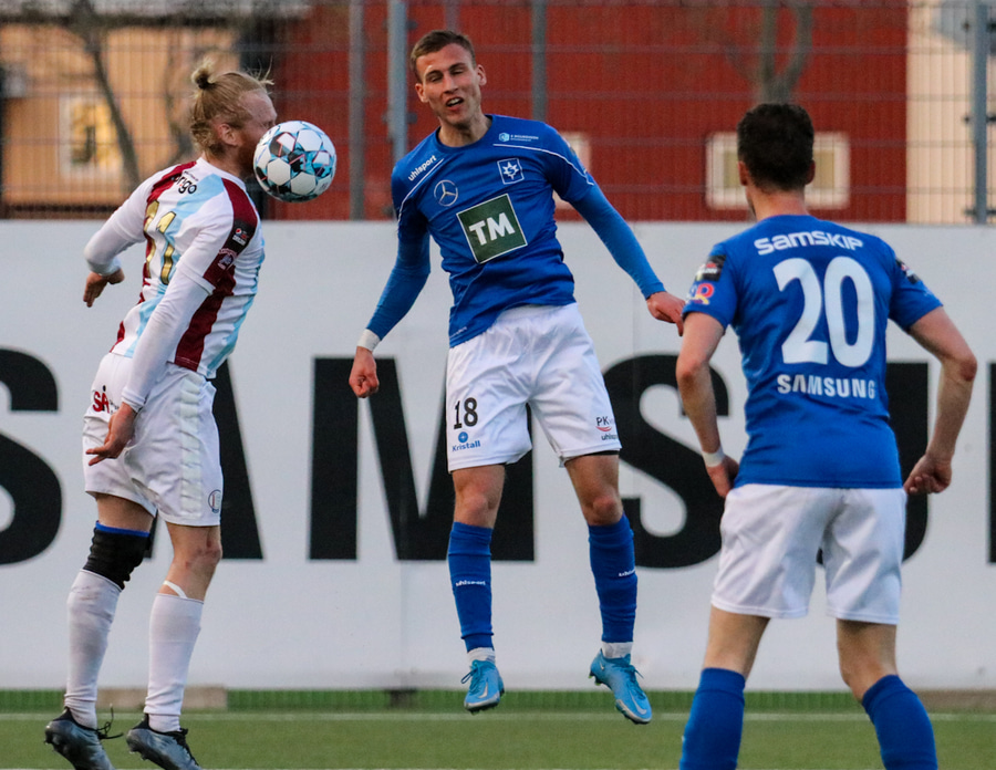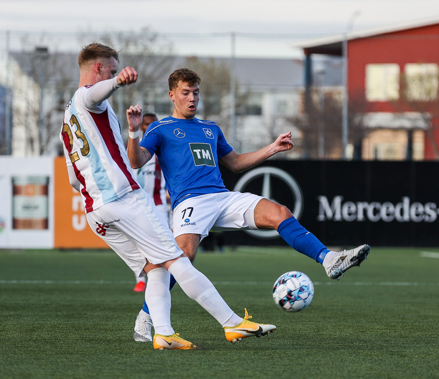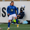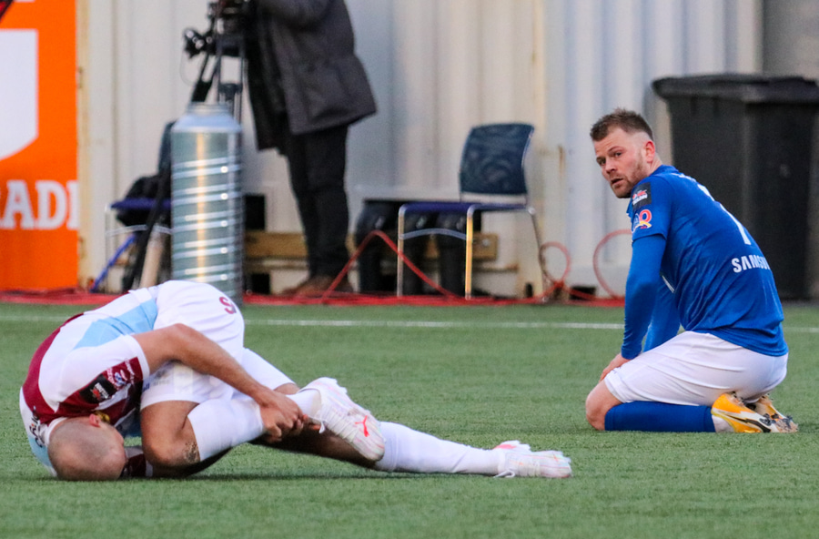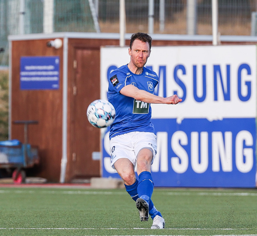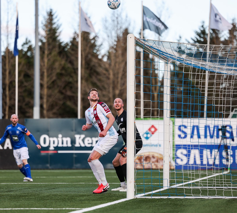 Danni Finnst tekur spyrnuna beint á Binna Hlö sem nær skallanum en boltinn beint á Halla.